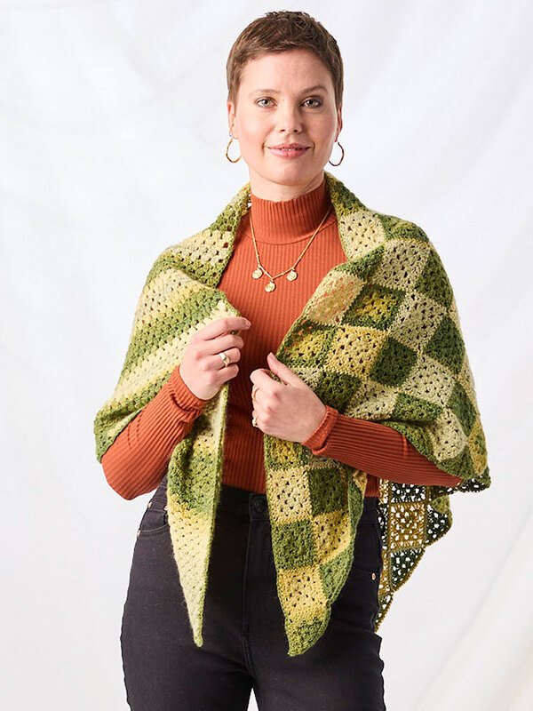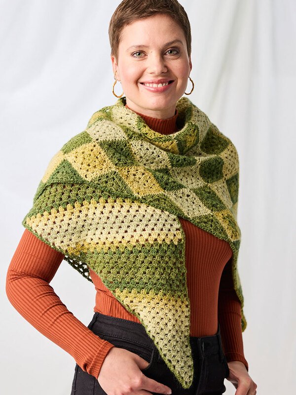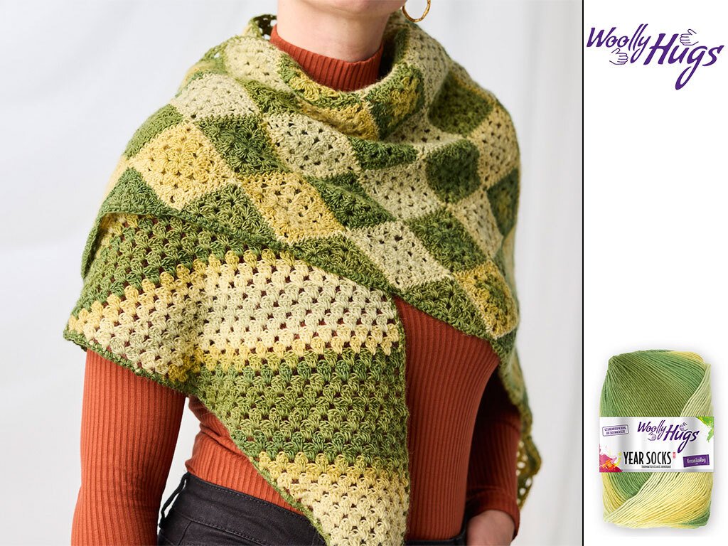 Dieses stylische Dreieckstuch Georgia besticht durch sein faszinierendes Rautenmuster im Granny-Style, das durch den harmonischen Farbverlauf der Woolly Hugs YEAR SOCKS in lebendigen Grüntönen perfekt zur Geltung kommt.