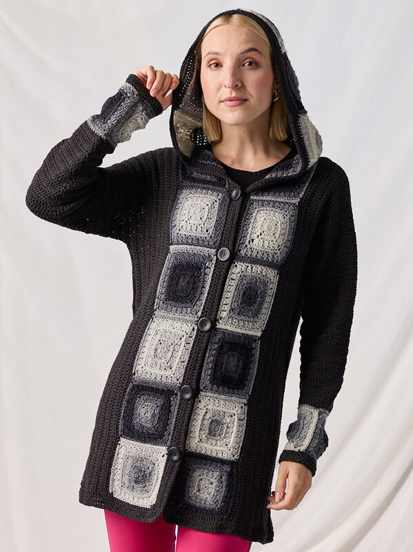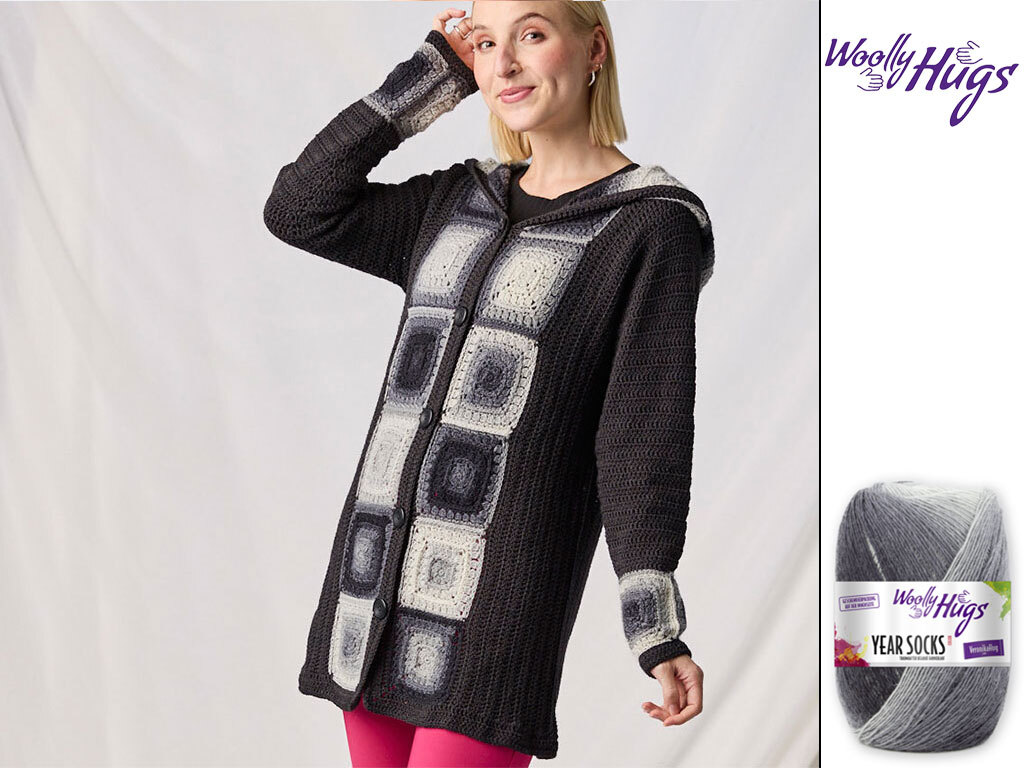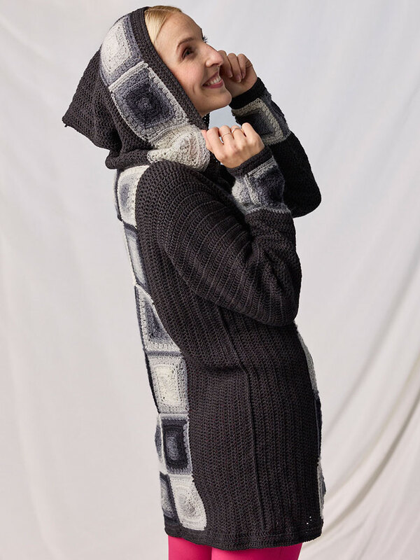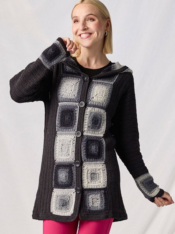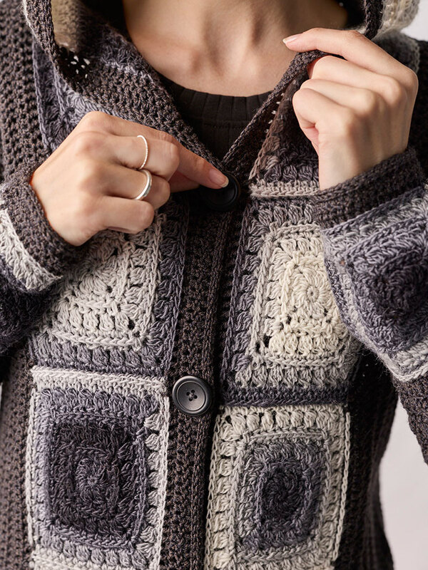 Die gemütliche Kapuzenjacke Gillian vereint zeitlose Eleganz mit modernem Häkeldesign, wobei die markante Knopfleiste aus Granny Squares in edlen Grautönen zum absoluten Blickfang wird.