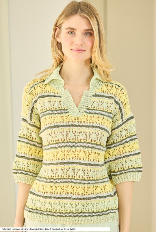 Dieser Pullover mit bis knapp über die Ellbogen reichenden Ärmeln besticht mit seinem Spiel aus Transparenz und Struktur: Der Mustermix mit breiteren Ajourmuster-Streifen, die durch glatt rechts, kraus rechts und Fallmaschenmuster voneinander getrennt sind, wird durch die viererlei Farben noch unterstrichen. Ein Poloauschnitt mit entsprechendem Kragen verleiht dem Design eine sportliche Note. Beides und auch die übrigen Bündchen werden im Rippenmuster mit rechts verschränkten und linken Maschen gearbeitet. Insgesamt ein durchaus sommerliches Modell aus reiner Baumwolle. Eine Anleitung gibts für die Größen 36/38, 40/42 und 44/46.