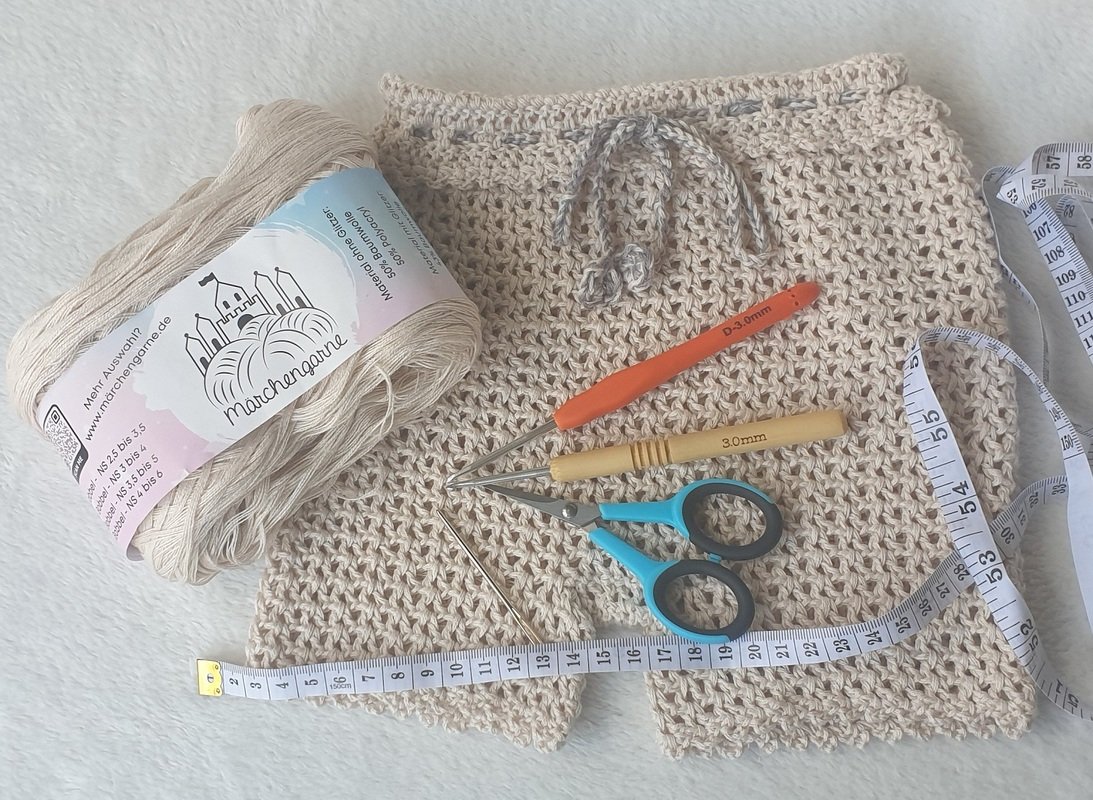 Du kannst die Hose mit jedem beliebigen Garn häkeln! Da die Maße konsequent in Zentimetern (cm) und
