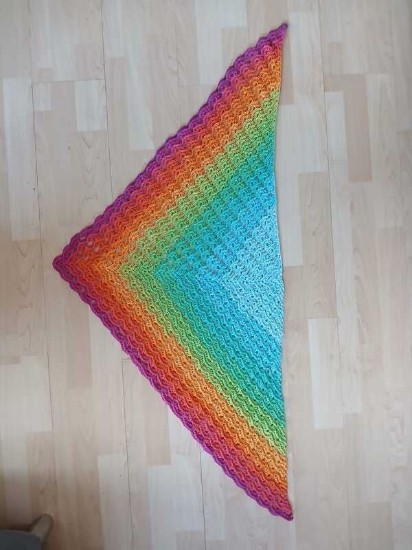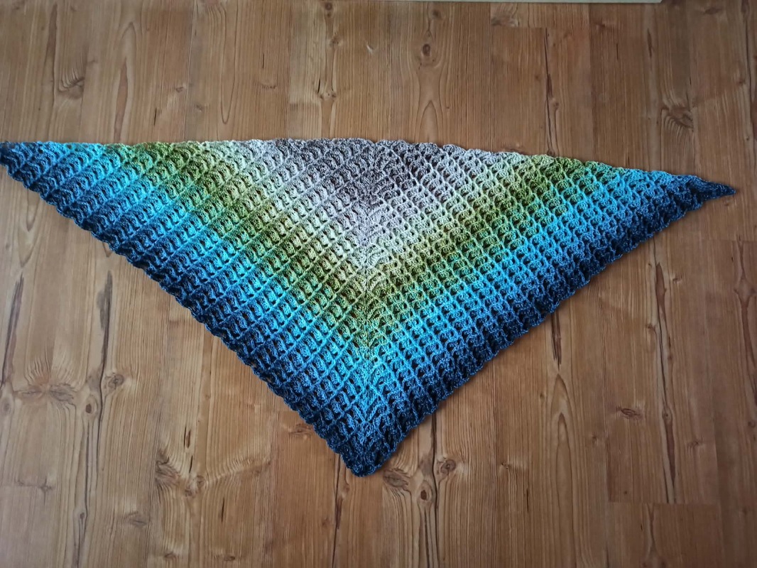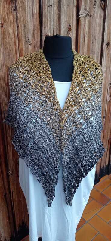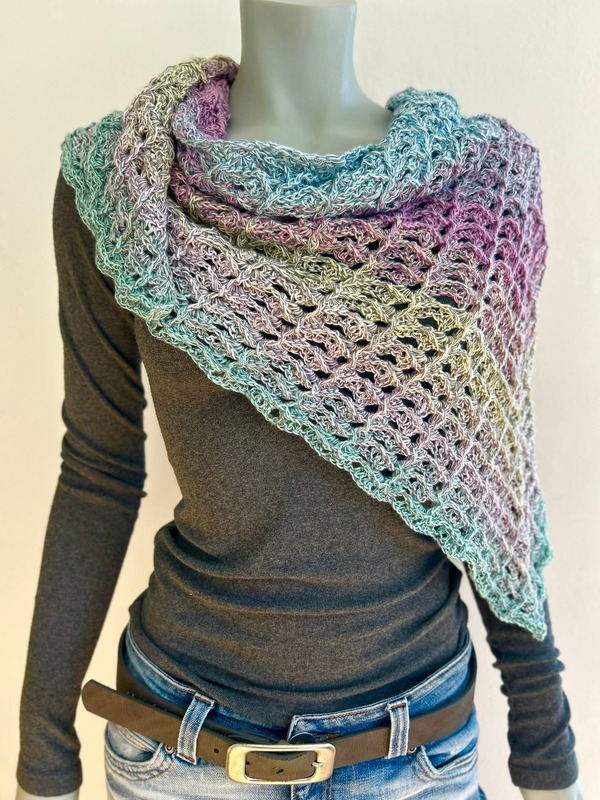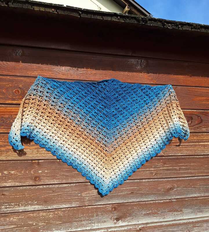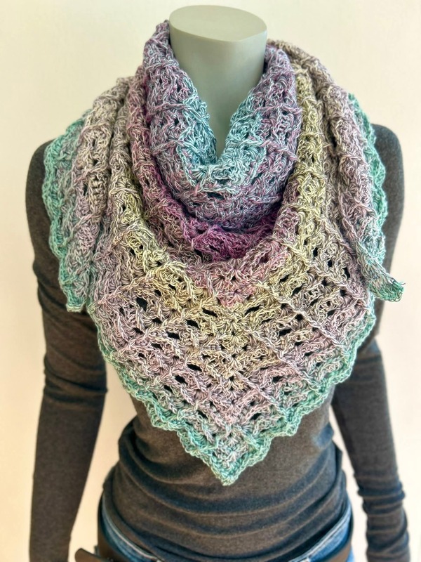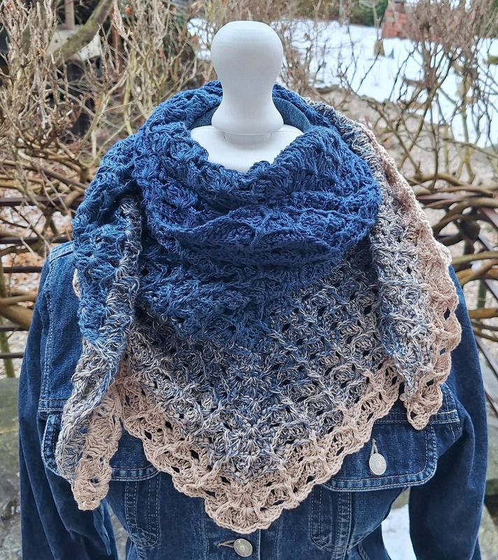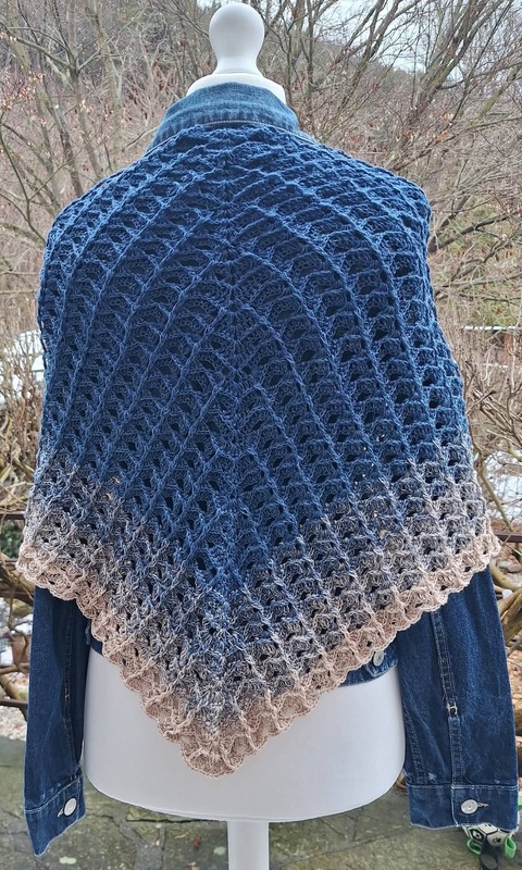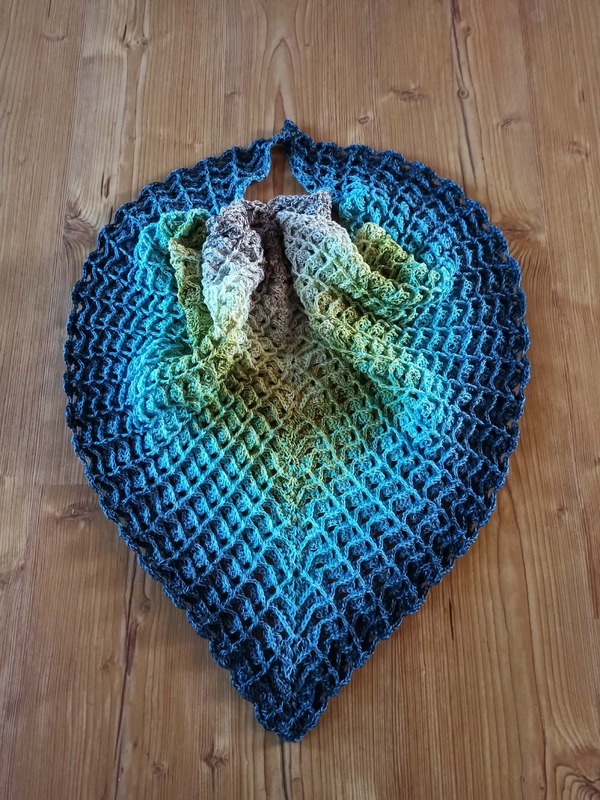 Das Tuch wird von oben nach unten gehäkelt und entwickelt dabei seine charakteristische Dreiecksform.