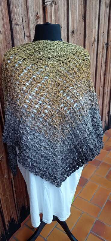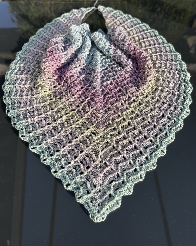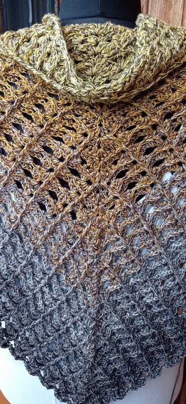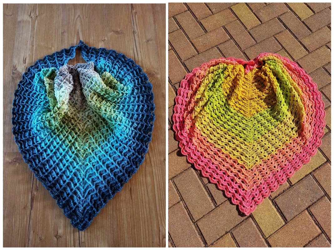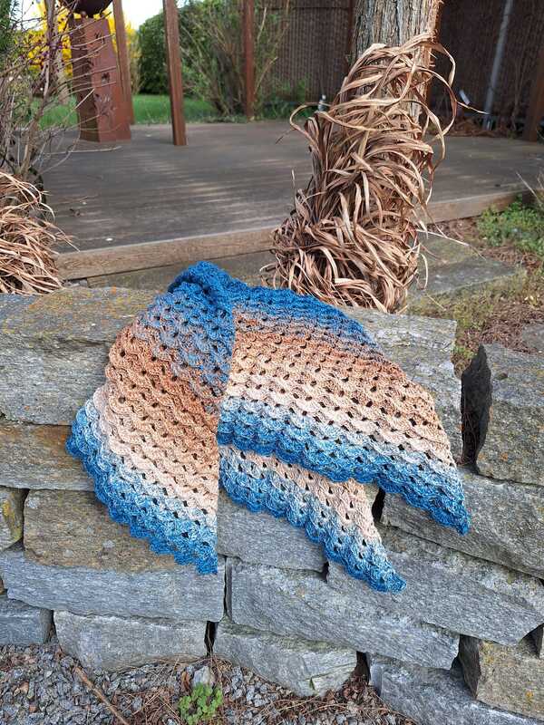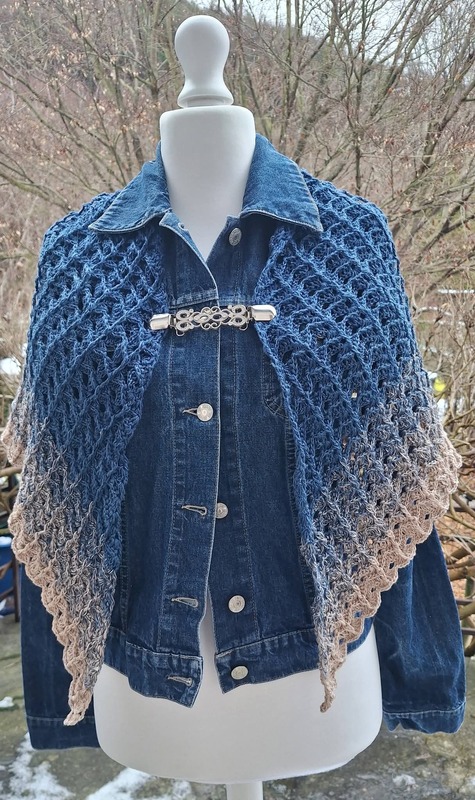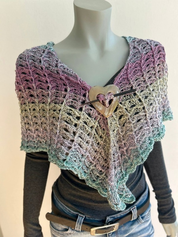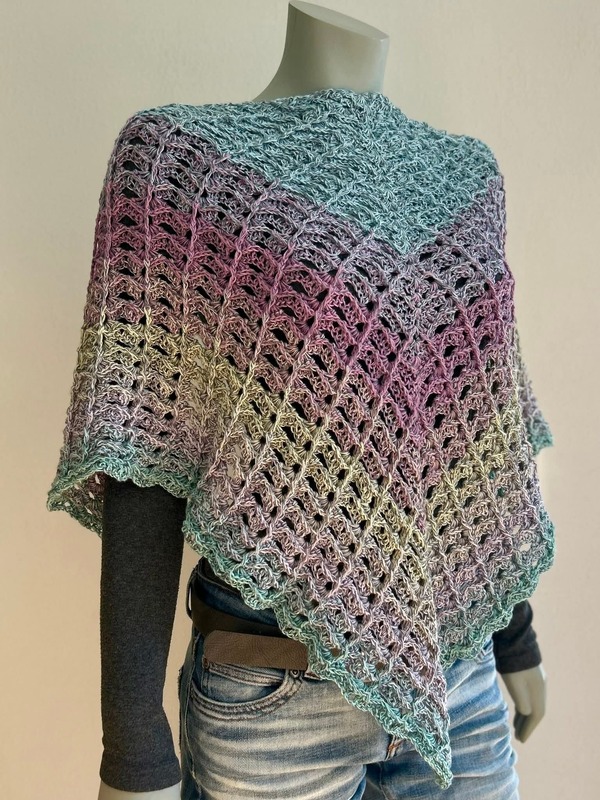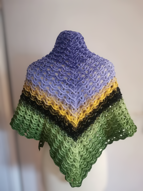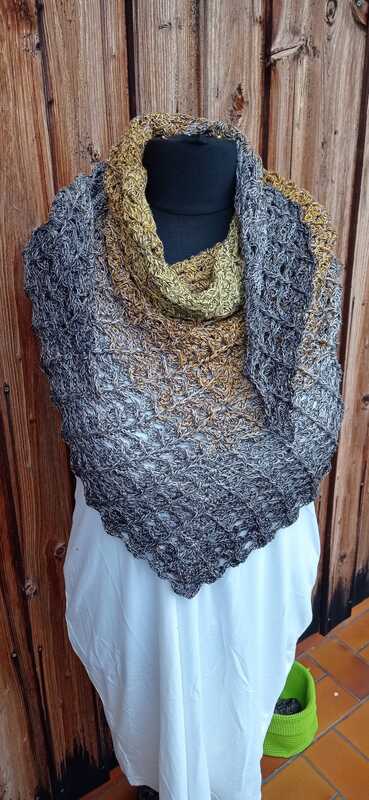 Das Tuch wird von oben nach unten gehäkelt und entwickelt dabei seine charakteristische Dreiecksform.