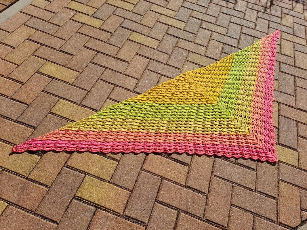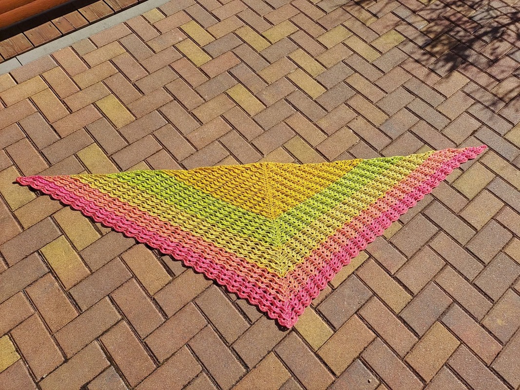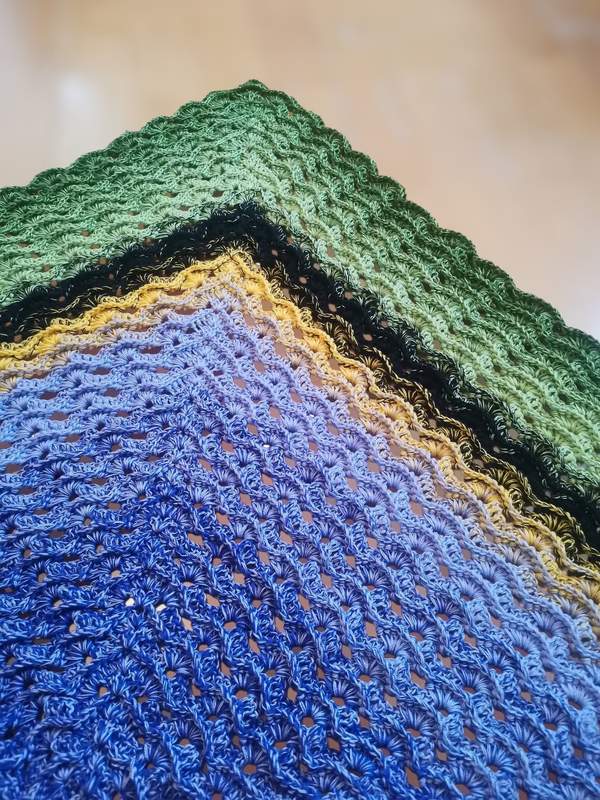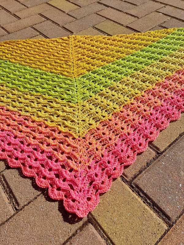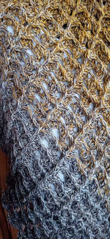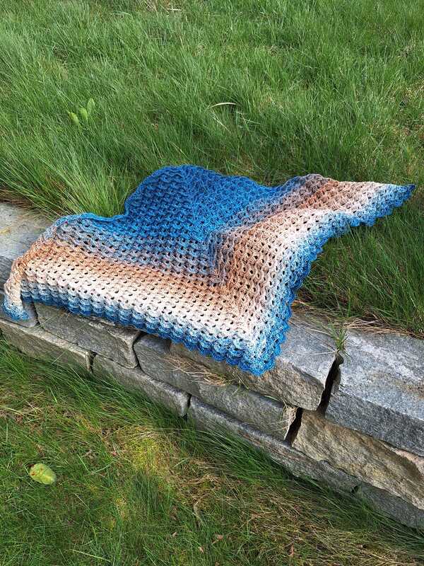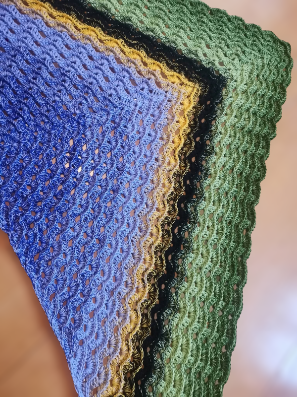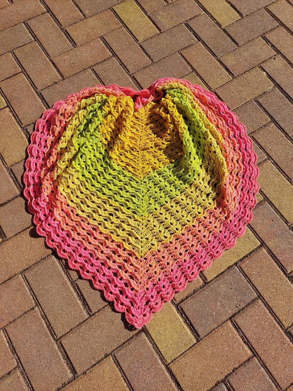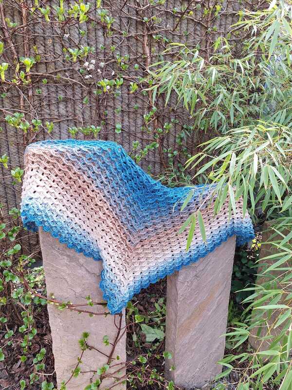 Das Tuch wird von oben nach unten gehäkelt und entwickelt dabei seine charakteristische Dreiecksform.