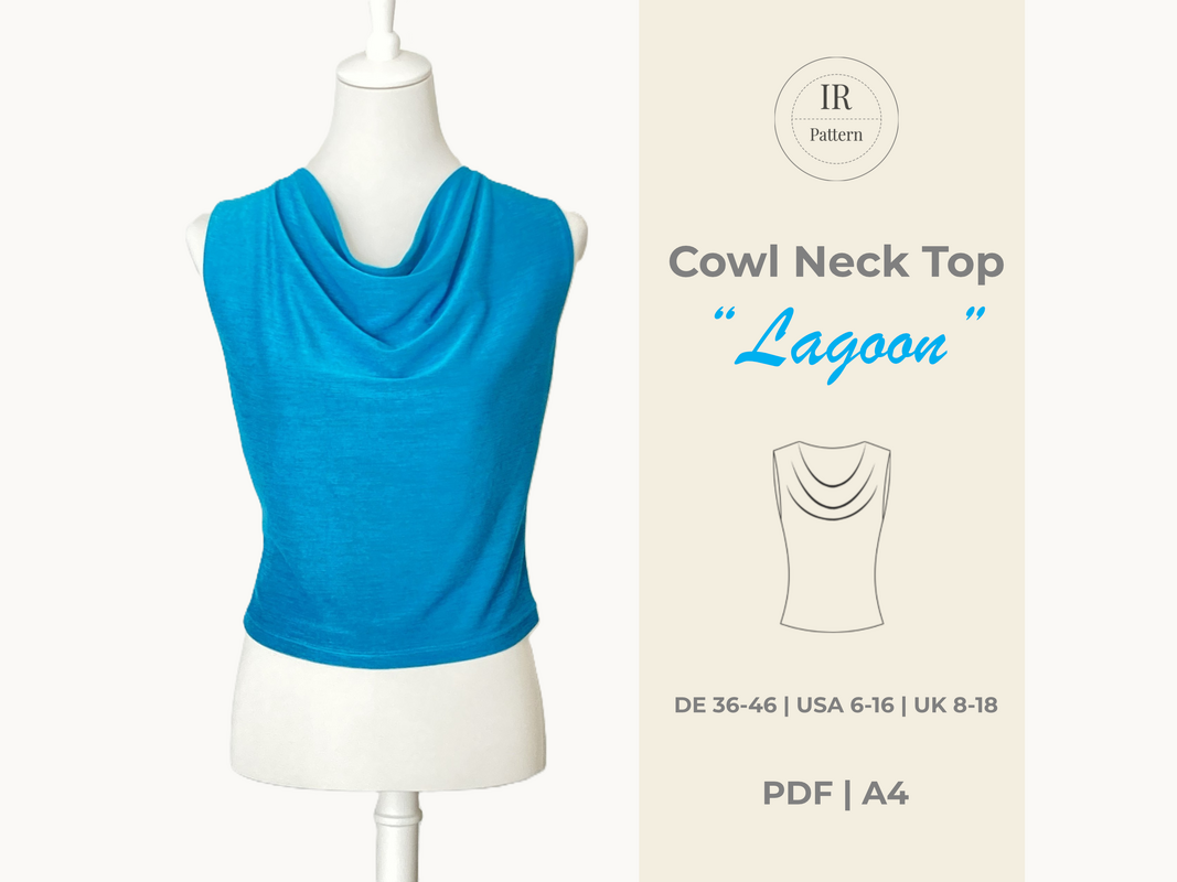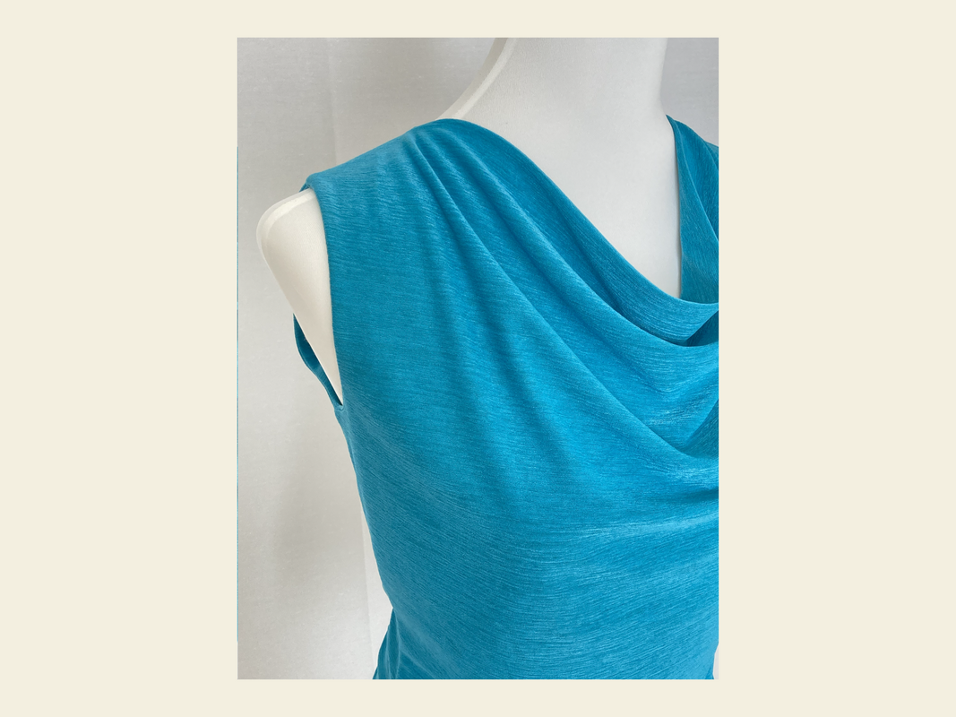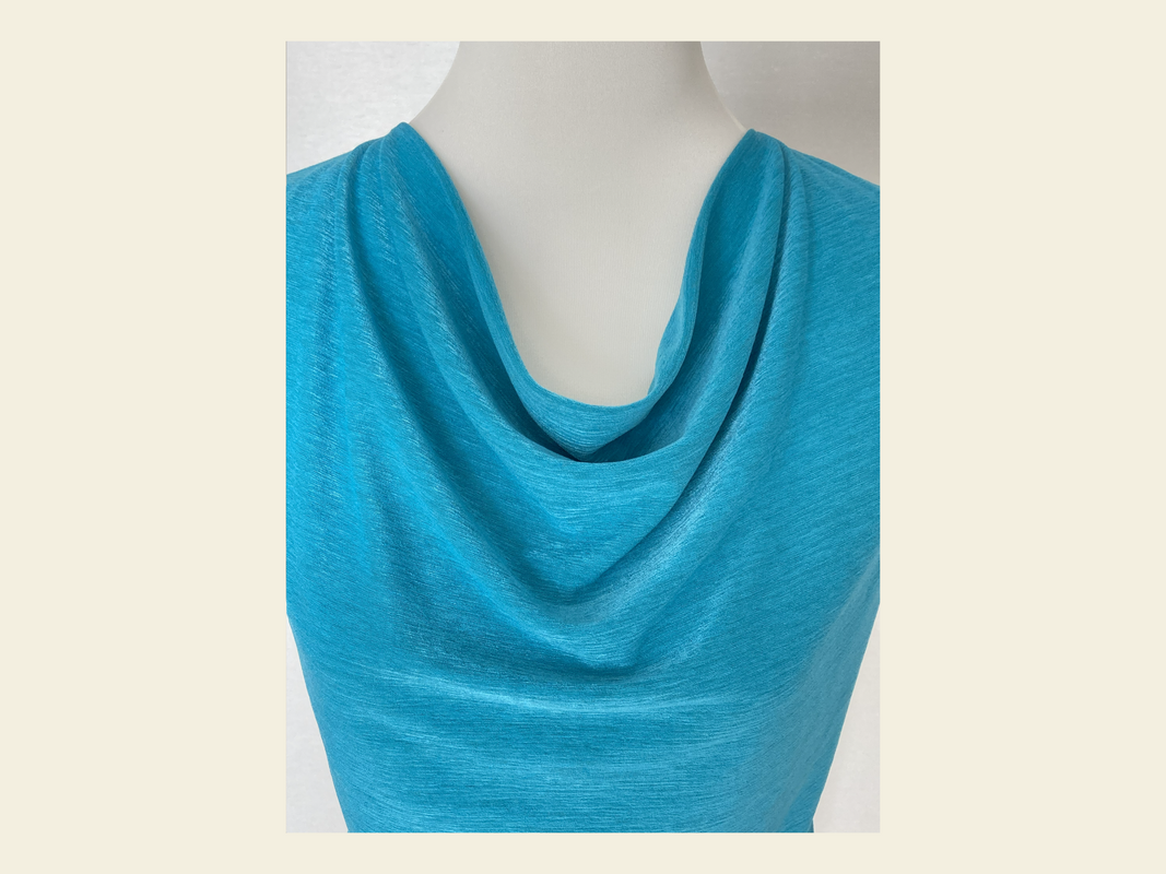 Stoff: Elastischer Jersey (z. B. Baumwoll-Jersey, Viskose-Jersey oder Modal). Viskose-Jersey fällt besonders schön weich für den Wasserfallausschnitt.