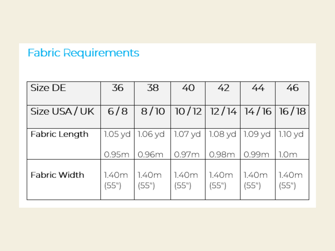 Verbrauch: ca. 1,0 m bis 1,2 m (bei einer Stoffbreite von 1,40 m, je nach Größe).