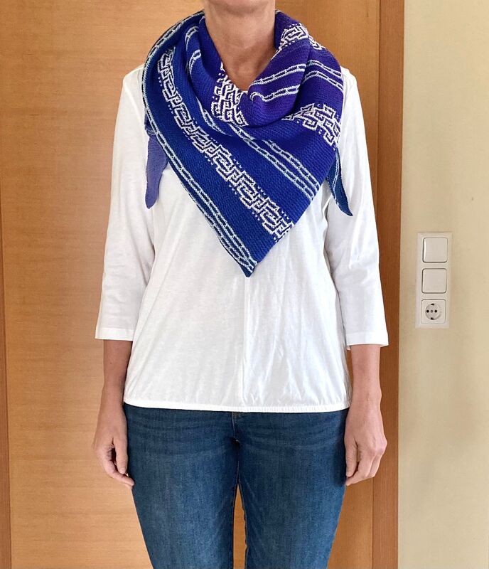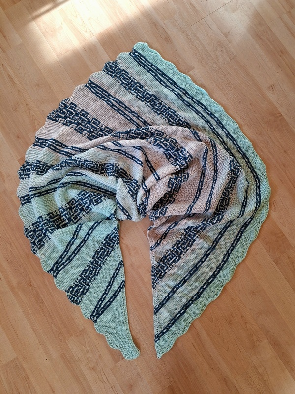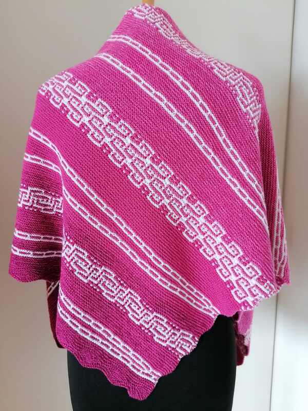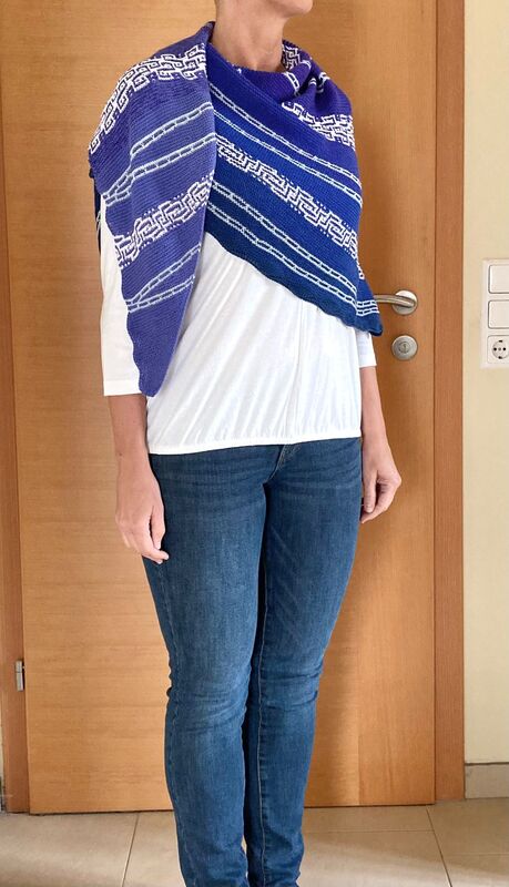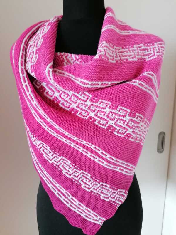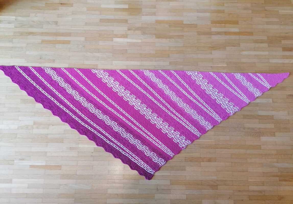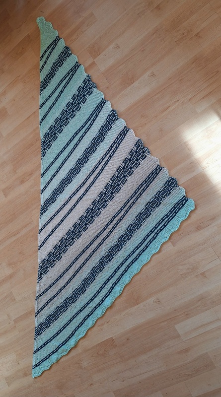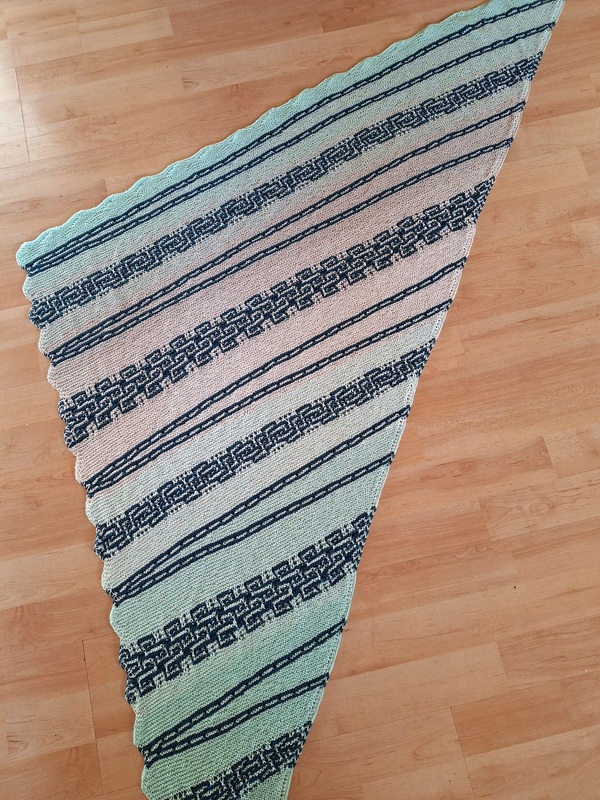 Es ist ein fast gleichschenkeliges Dreieckstuch, mit Hebemaschen und verkürzte Reihen.