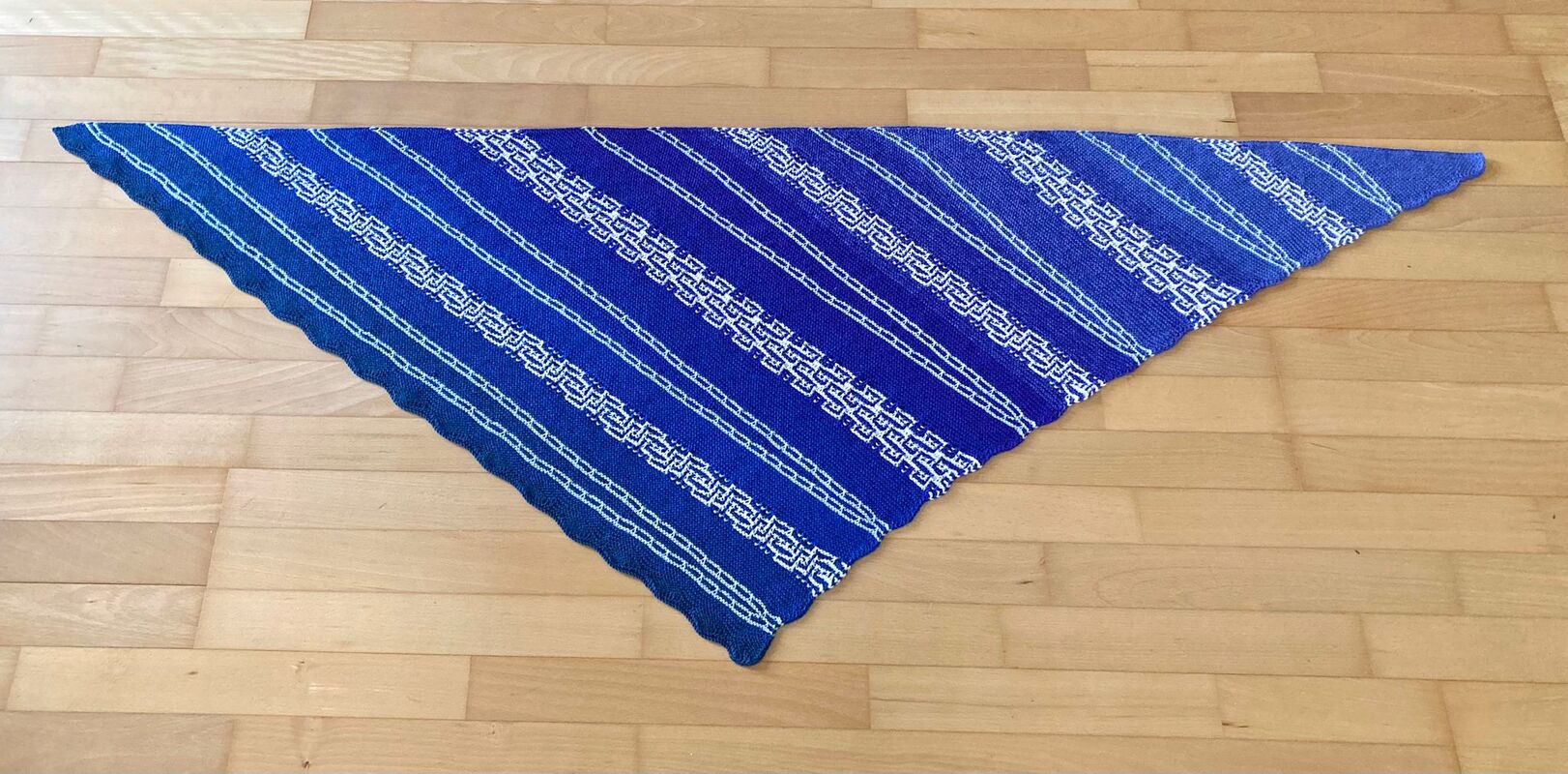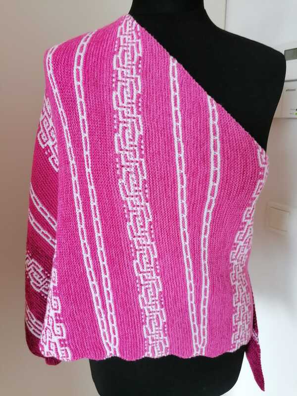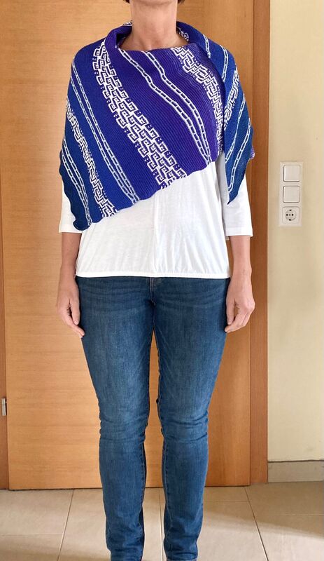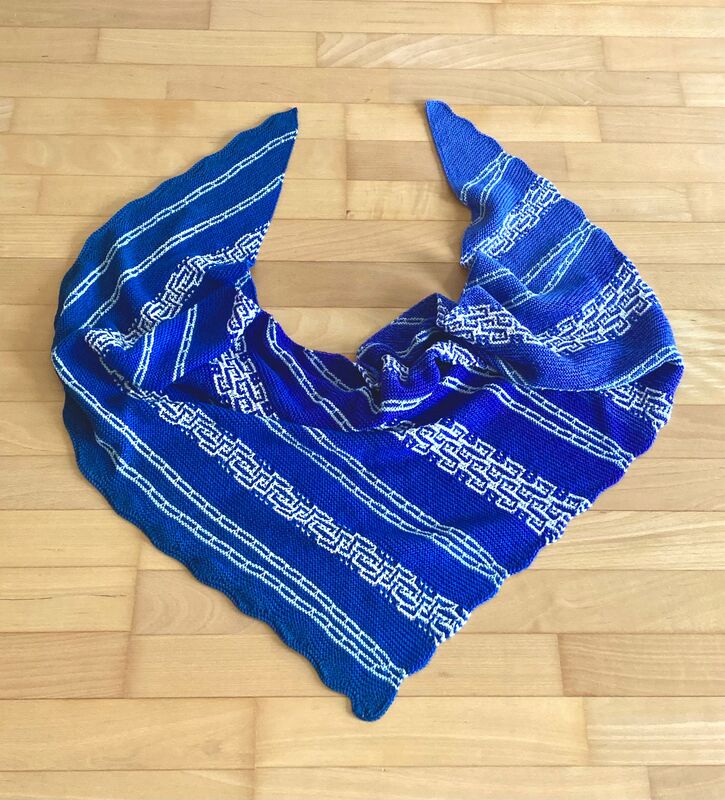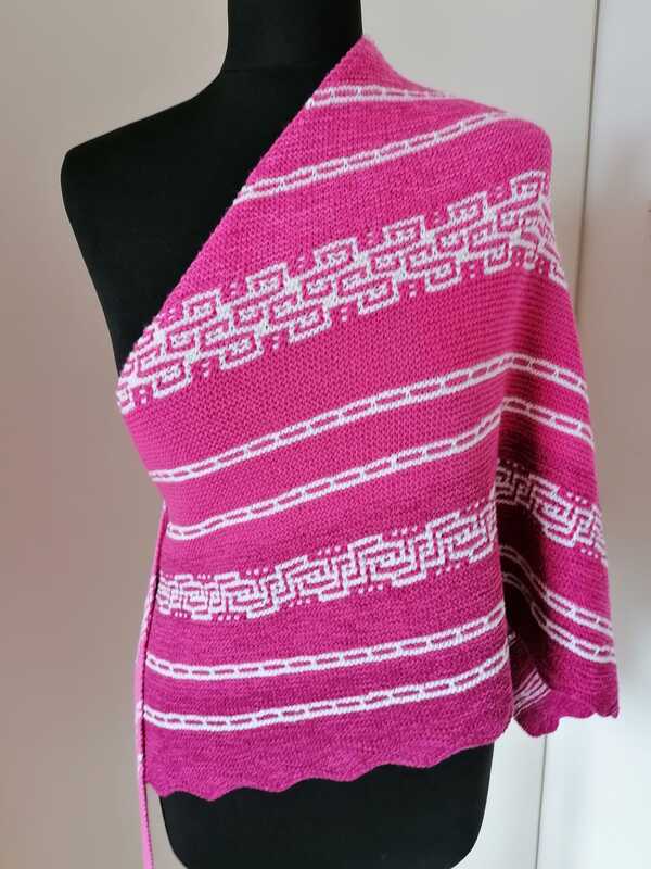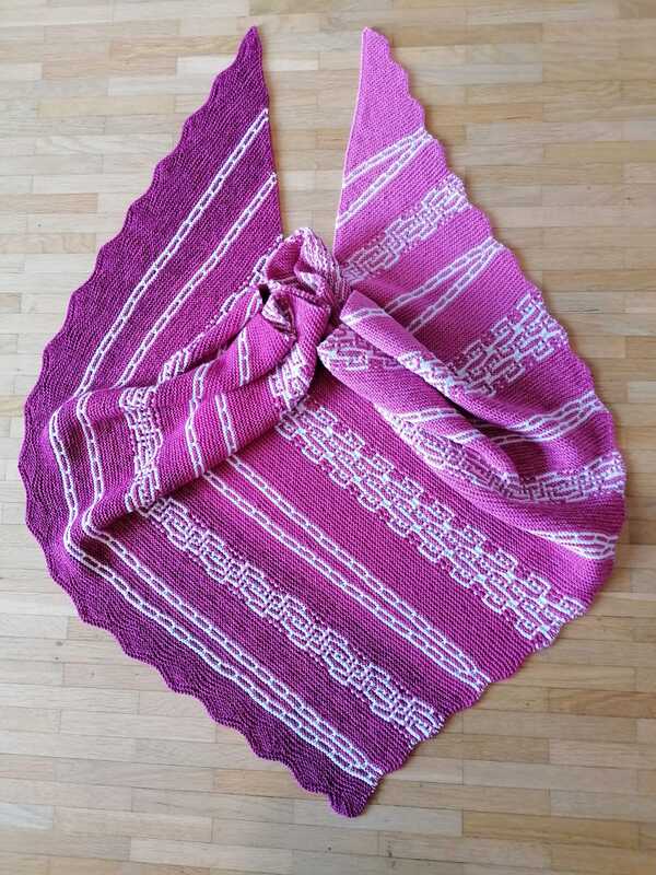 Es ist ein fast gleichschenkeliges Dreieckstuch, mit Hebemaschen und verkürzte Reihen.
