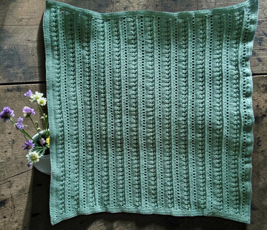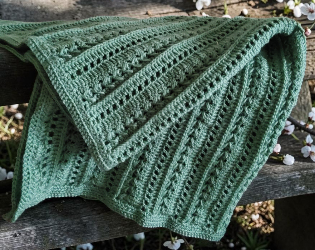 Die Anleitung besteht aus 8 Seiten und ist bebildert. Die Decke kann in jeder Gräße nachgearbeitet werden.