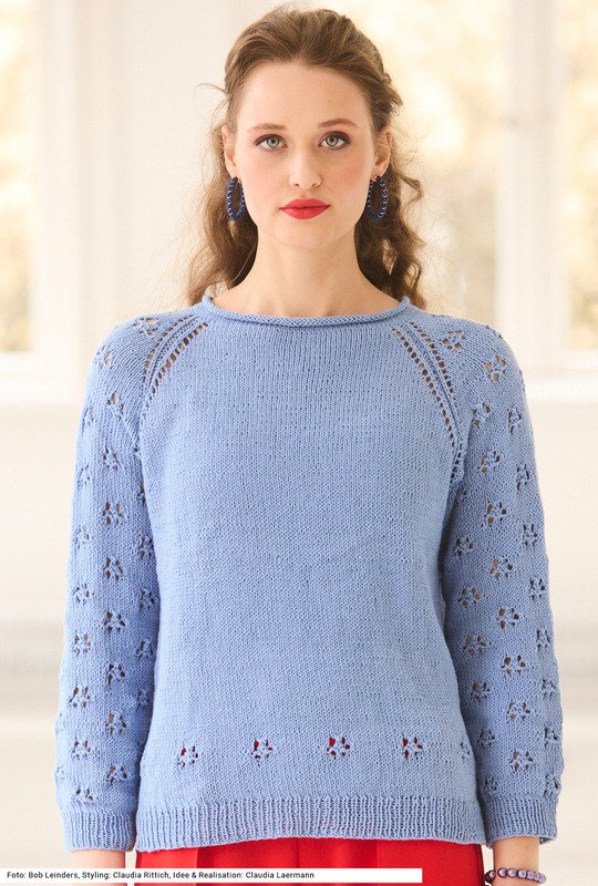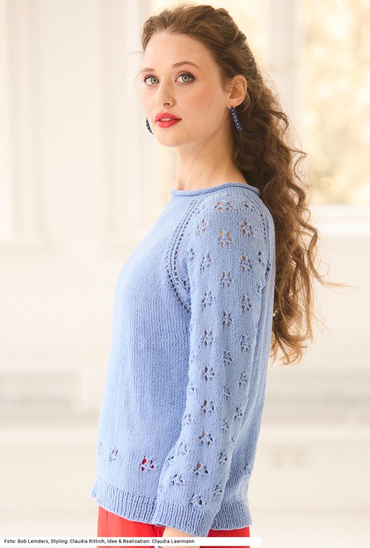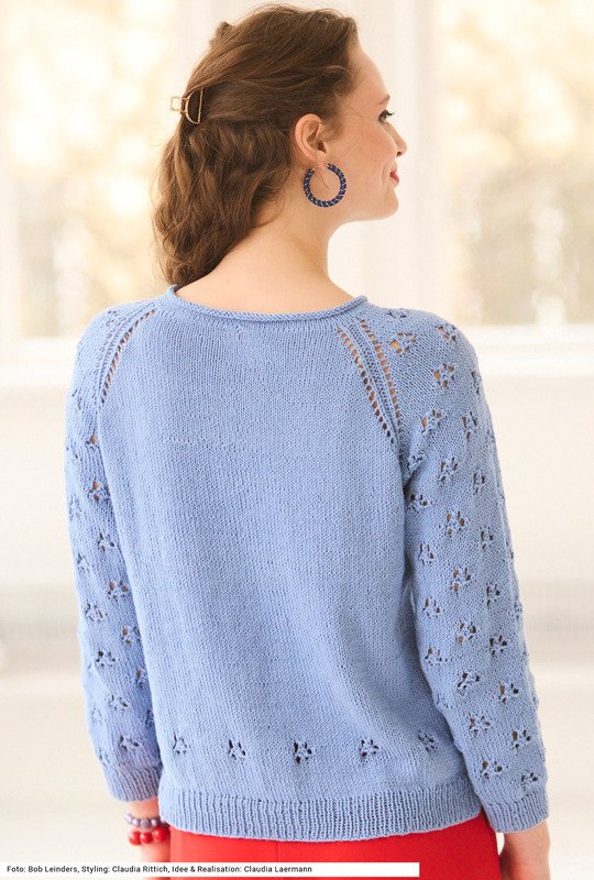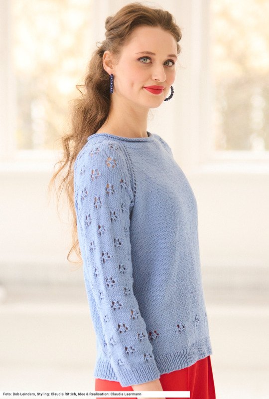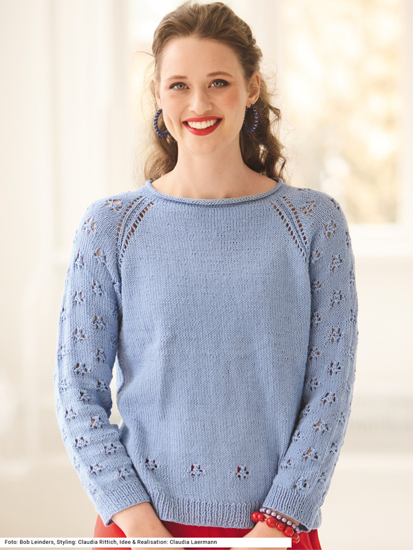 Dieser feminine Pullover mit klarer Linienführung wird von oben nach unten in einem Stück gestrickt. Die Raglanschrägungen sind durch Lochmusterstreifen betont. Daneben entfaltet sich das zarte Blütenmuster komplett über die Ärmel und setzt die Schultern elegant in Szene. Einzelne Blüten kommen noch einmal oberhalb des Rippenbunds zur Geltung. Der Rumpf-Bereich wird schlicht glatt rechts gearbeitet, sodass nichts die Wirkung der floralen Elemente schmälert. Die Anleitung für ein Garn aus Baumwolle und Viskose gibts für die Größen 36/38 und 40/42 sowie 44/46**.**