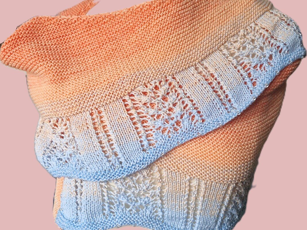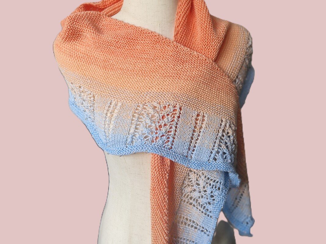 Das Tuch wird von der Nackenmitte aus gestrickt mit beidseitigen Zunahmen. Du strickst kraus rechts bis zu einer Tiefe von ca. 25 cm. Dann schließt sich ein Lace-Teil an, in den Perlen eingestrickt werden. Den Abschluss bilden 3 Kraus-rechts-Rippen. In die Abkettkante werden ebenfalls Perlen eingestrickt.