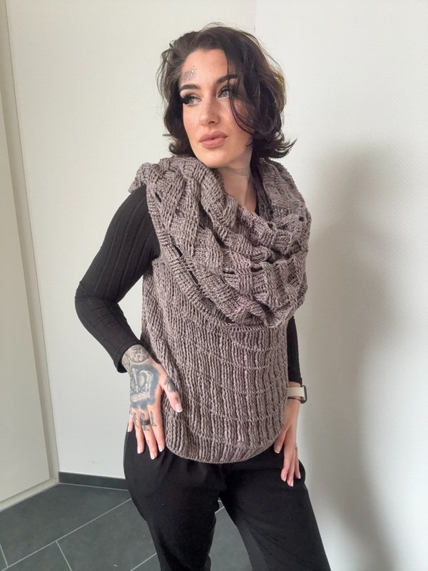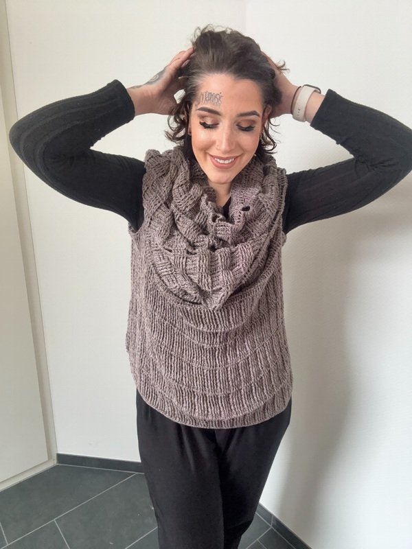 Trägst du die längere Seite oben, zauberst du ein effektvolles Oberteil mit einem lässigen Wasserfallkragen oder sogar einer Kapuze. Drehst du das Kleid, entsteht im Handumdrehen ein wunderschönes Kleid mit einer stilvollen Passe, das deine Silhouette perfekt in Szene setzt.