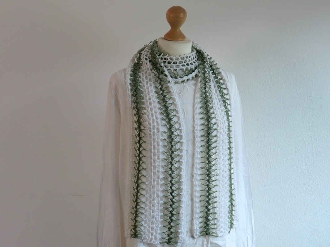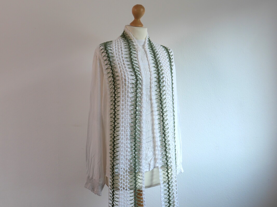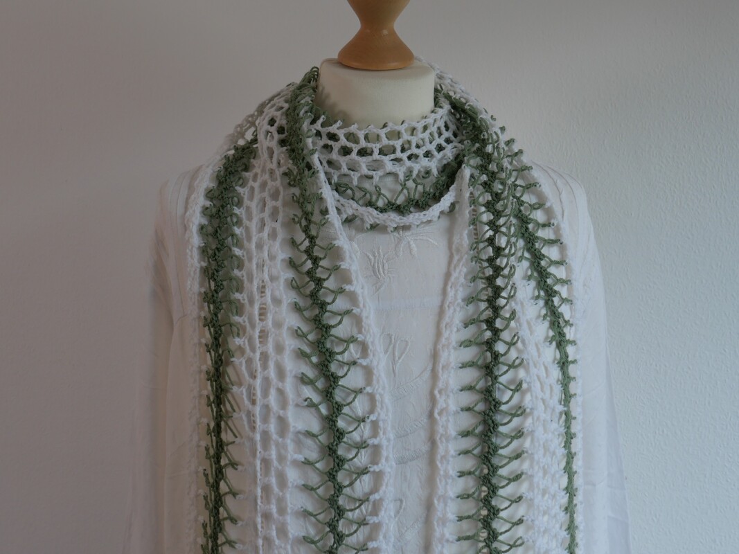 Dieser luftige Laceschal ist genau das Richtige für alle, die feine, leichte Accessoires lieben. Mit der Technik des Gabelhäkelns entsteht ein besonders filigranes Muster, das dem Schal seine einzigartige, lockere Struktur verleiht. Die Kombination aus zarten Maschen und dekorativen Details macht ihn zu einem echten Blickfang – egal ob lässig zur Alltagskleidung oder elegant zum besonderen Anlass getragen.