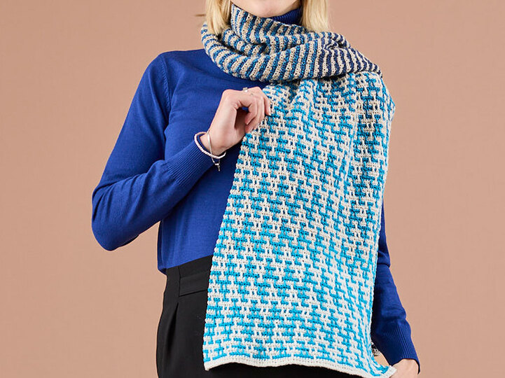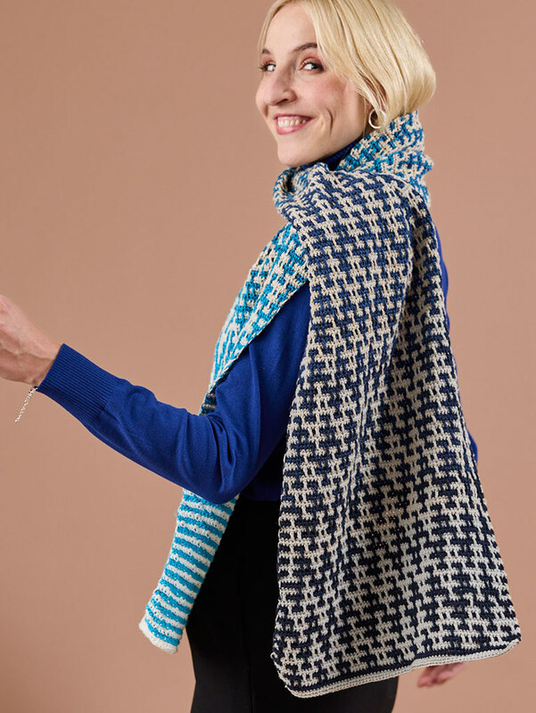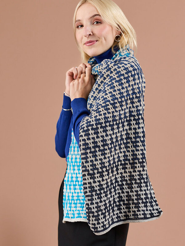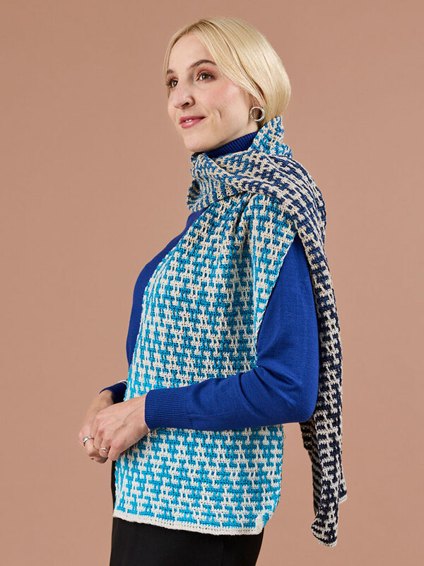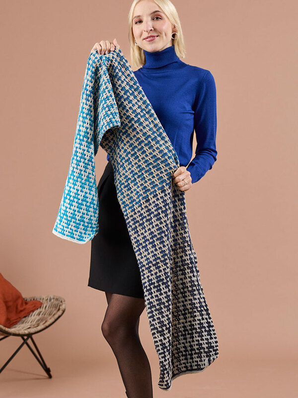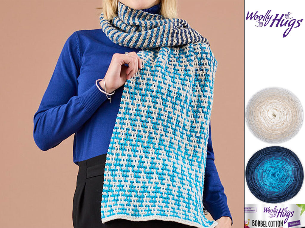 Diese elegante Stola aus der Woolly Hugs BOBBEL COTTON Kollektion besticht durch ein faszinierendes Mosaik-Muster, das die harmonischen Blau- und Beigetöne perfekt in Szene setzt. Dank der zwei kombinierten Farbverläufe entsteht ein moderner, grafischer Look, der deinem Outfit eine ganz besondere Struktur und Tiefe verleiht.