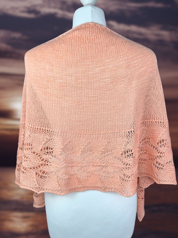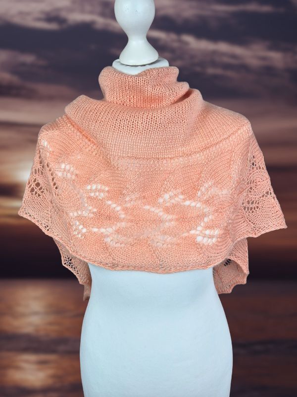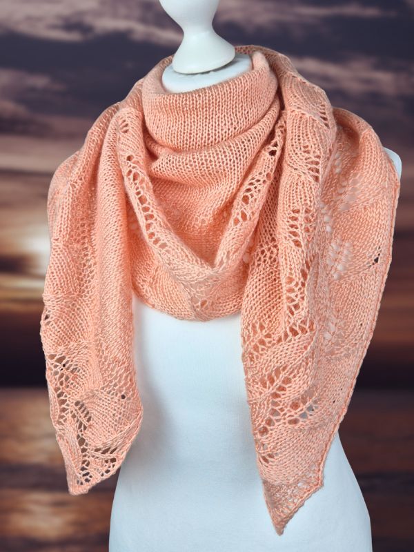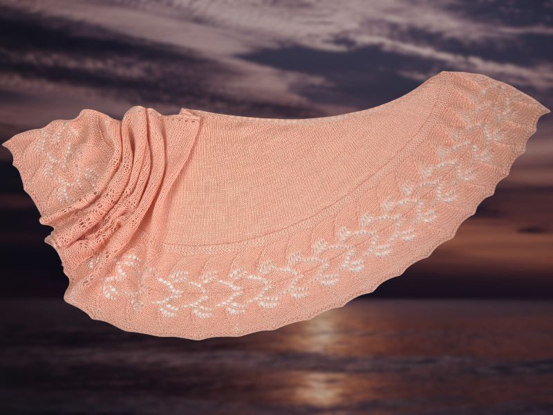 Sunset Arc ist ein elegant geschwungener Halbrundschal, der sich angenehm über Schultern und Hals legt – ganz ohne zu verrutschen. Die feine Lace-Bordüre verleiht deinem Strickstück eine besondere Leichtigkeit und lässt deine Strickkunst sofort erkennen.