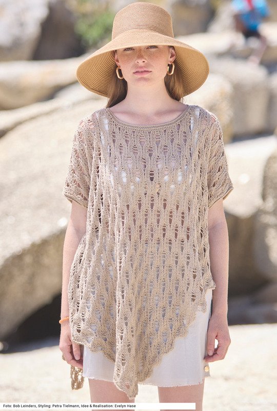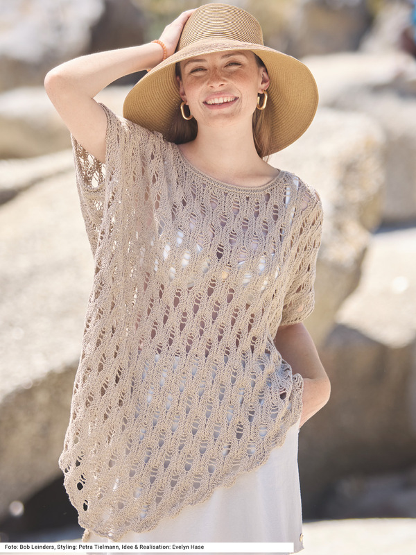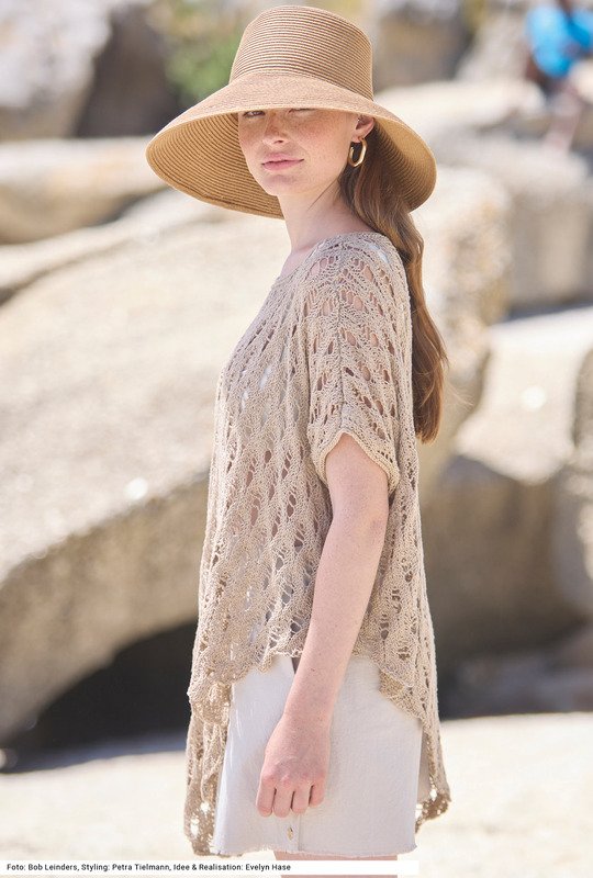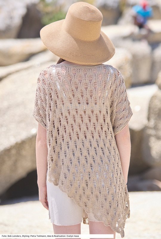 Dieses Shirt aus einer feinen Seide-Baumwolle-Mischung besticht durch sein harmonisches, einfach zu strickendes Ajourmuster und den natürlichen Glanz des Garns. Das Besondere ist jedoch der asymmetrische Schnitt, der dafür sorgt, dass das Top die Figur lässig umschmeichelt. Es eignet sich daher zum Beispiel auch ausgezeichnet als lässiger Überwurf über den Bikini, wenn am Strand die Sonne allzu stark brennt. Halsausschnitt und Armausschnitte bekommen einen Rollrand angestrickt. Eine Anleitung steht für die Größen 38 – 42 und 44 – 48 sowie 50 – 54 zur Verfügung.