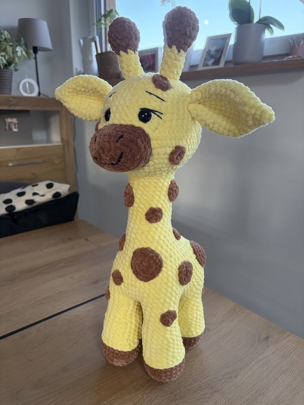Die fertige Giraffe aus Chenillewolle wird etwa 50 cm hoch und ist ein echter Hingucker im Kinderzimmer oder ein liebevolles, handgemachtes Geschenk. Durch die besondere Konstruktion kann die Giraffe selbstständig stehen und besitzt einen stabilen Hals, sodass sie ihre typische Giraffenhaltung behält.