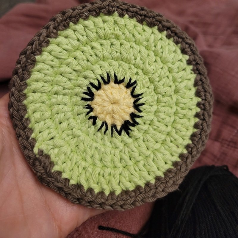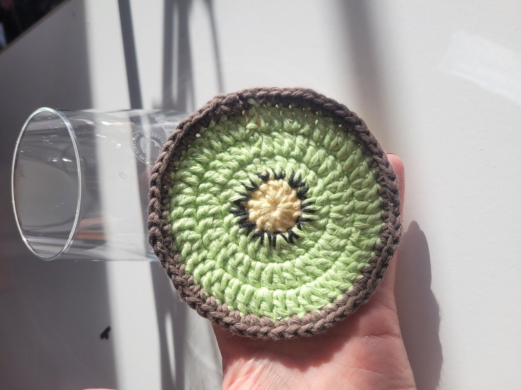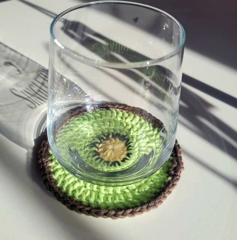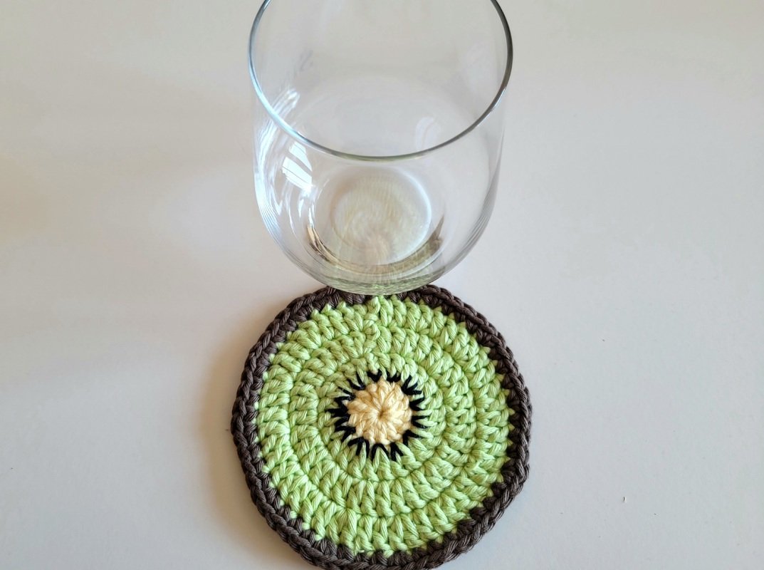 Hier findest du eine Häkelanleitung für einen sommerlichen Glasuntersetzer als "Kiwi".