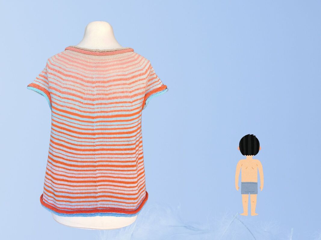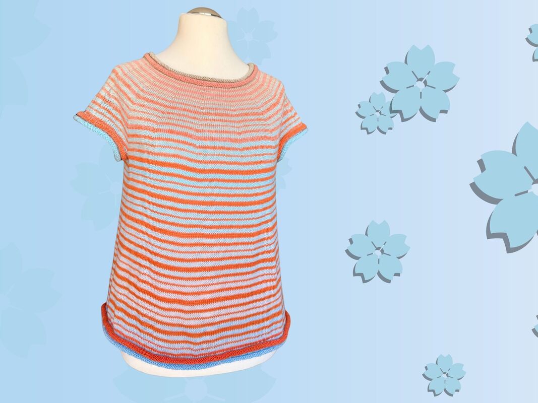 Gestrickt wird mit zwei unterschiedlichen 3-fädigen Garnen. Durch den Farbwechsel entstehen Ringel in variierenden Breiten, die dem Shirt eine lebendige und interessante Optik verleihen.