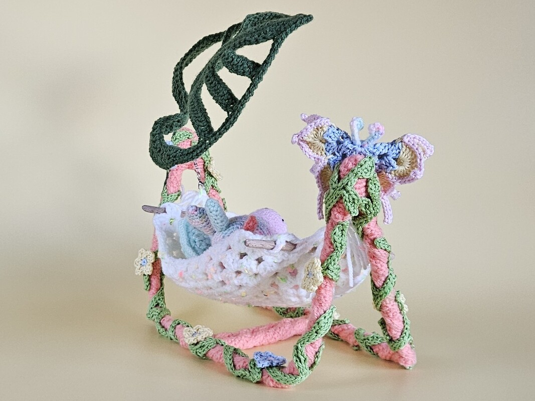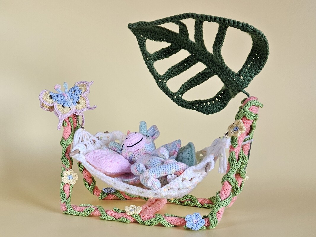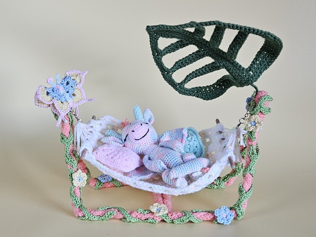 Das kleine Drachenbaby liegt entspannt in einer blumigen Hängematte und wird von einem großen Blatt beschützt. Die Kombination aus Figur und dekorativen Elementen macht dieses Design zu einem besonderen Hingucker.