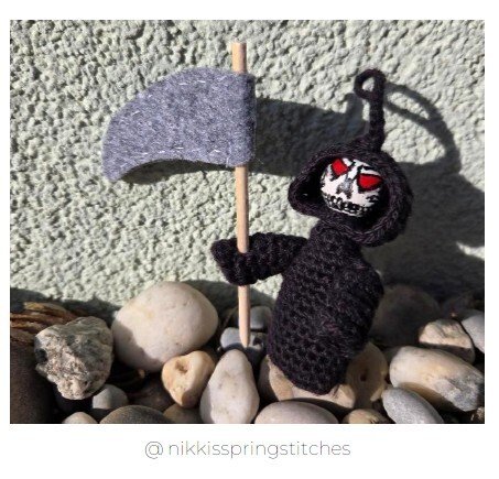 Mit dieser Anleitung entsteht ein kleiner gehäkelter Sensenmann – mit Kapuzenumhang, Ärmchen und einer selbstgebauten Sense. Klein, detailverliebt und ein echter Hingucker für alle, die es etwas düsterer mögen – aber mit Charme!