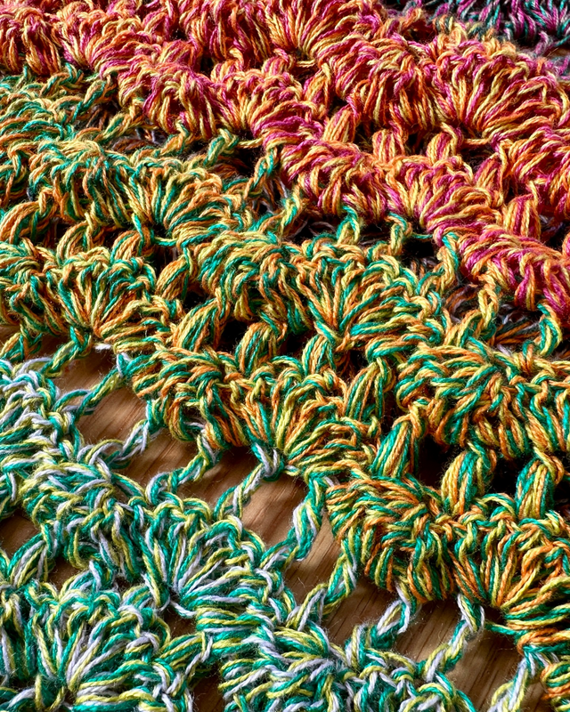 Meine Beispielstola hat eine Länge von 1,40m und eine Breite von 0,50m. Gehäkelt mit einem Bobbel (3-fädig/850m) und NS 3,5.