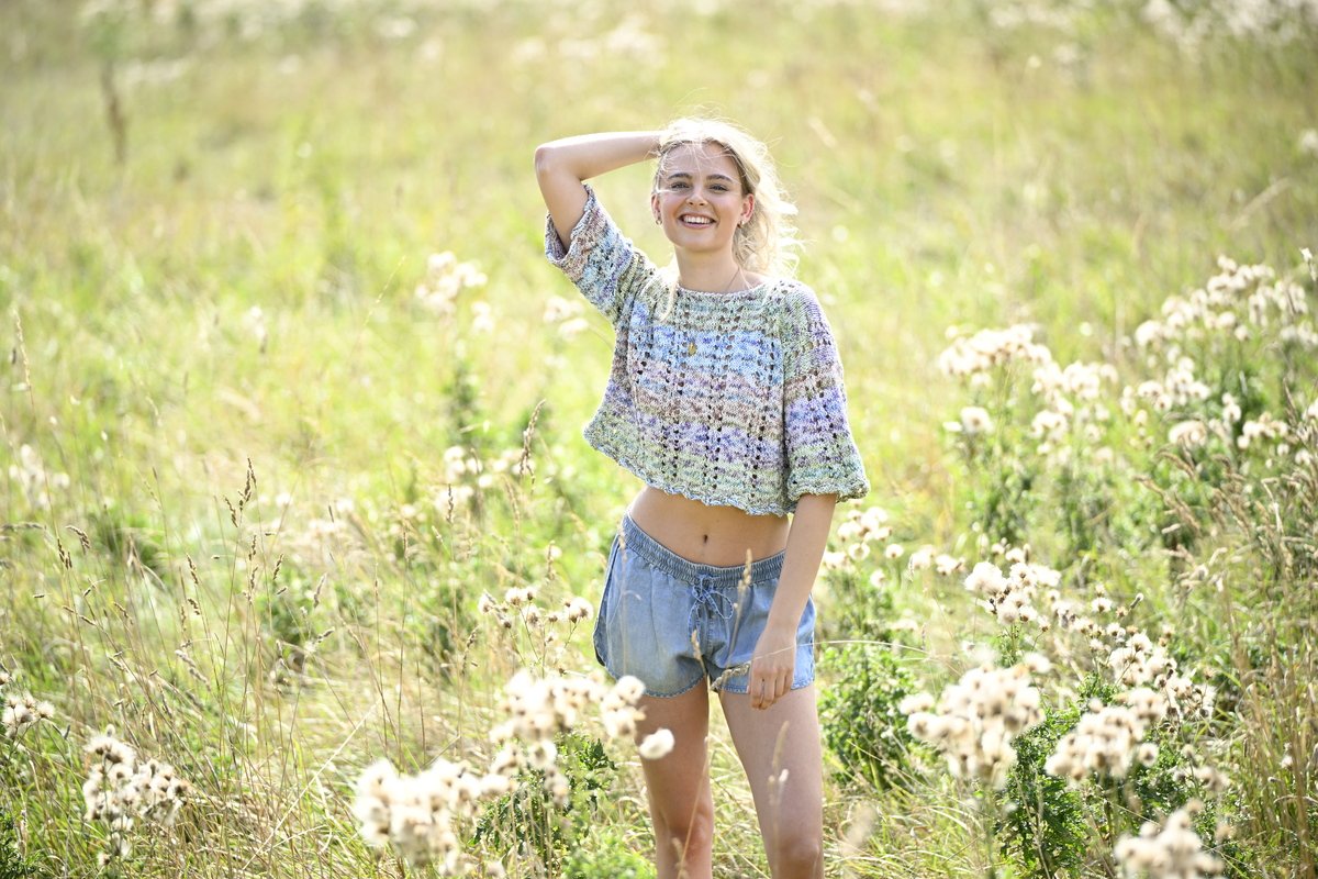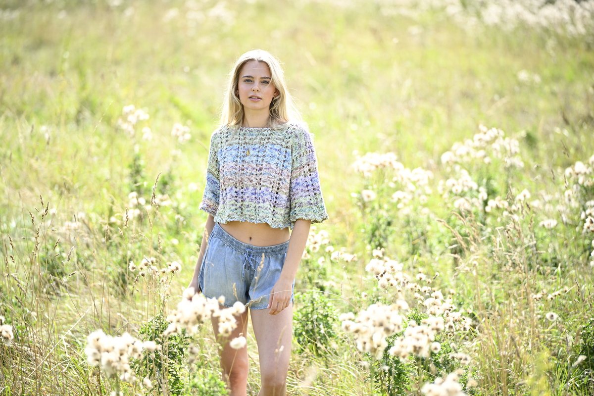 Eine harmonische Farbkombination und die wellenförmigen Abschlüsse verleihen diesem kurzen Pulli mit weiten Ärmeln seinen unwiderstehlichen Charme.