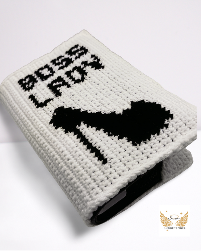 Häkelanleitung A6-Binder Hülle „Boss Lady" – Farbwechsel-Muster mit Schriftzug und High Heel Motiv