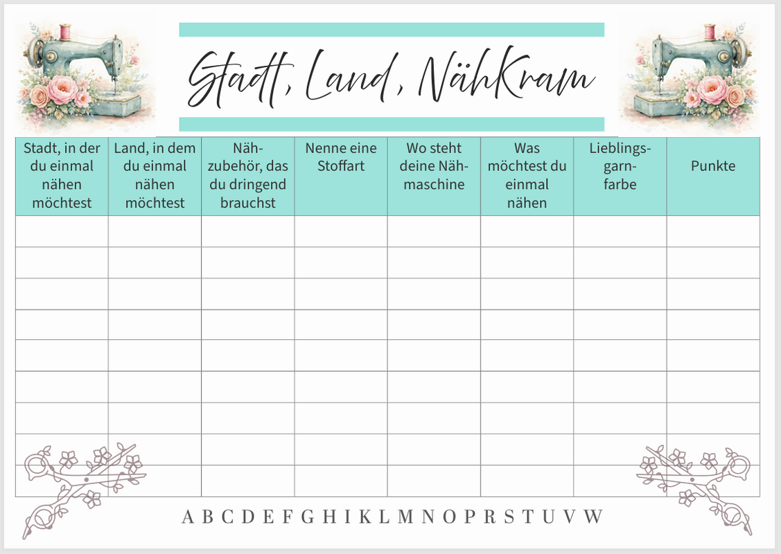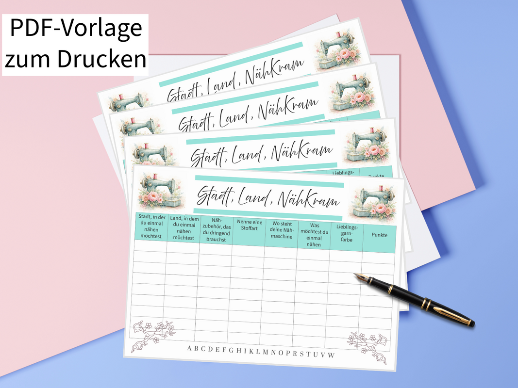 Erlebe eine liebevoll gestaltete Druckvorlage für ein Stadt, Land, Flussspiel zum Thema "Nähen" - just for fun!