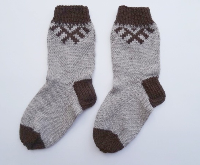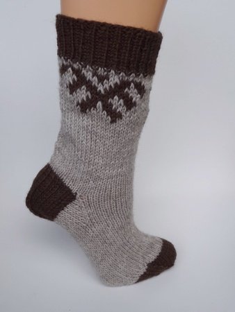 Da die finnische Wolle (7 veljestä von Novita) in Deutschland nicht erhältlich ist, hier Vorschläge für entsprechende Garne. 150g der Wolle 7 veljestä entsprechen 300 m. Für die Socken habe ich ca. 120-150 g in Farbe A (hellbraun) und 50 - 60 g in Farbe B (dunkelbraun) benötigt.