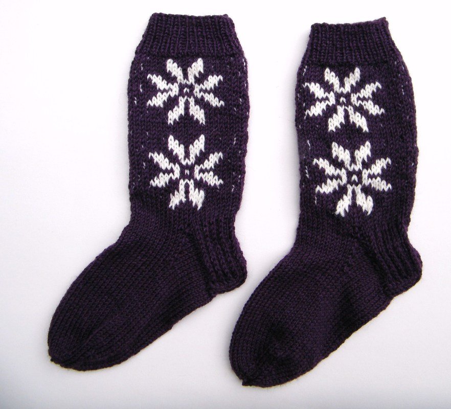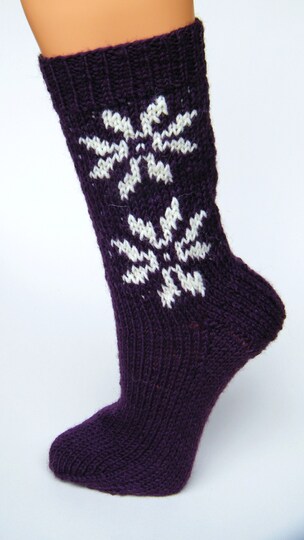 Da die finnische Wolle (7 veljestä von Novita) in Deutschland nicht erhältlich ist, hier Vorschläge für entsprechende Garne. 150g der Wolle 7 veljestä entsprechen 300 m. Für die Socken habe ich ca. 150 g in dunkellila und 50 g in weiß benötigt.