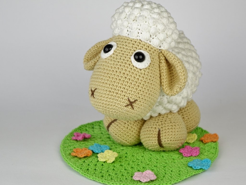 Detailed instructions and pictures help you to crochet all parts of the sheep and the meadow in bloom and attach them together to complete your sweet Wolli.