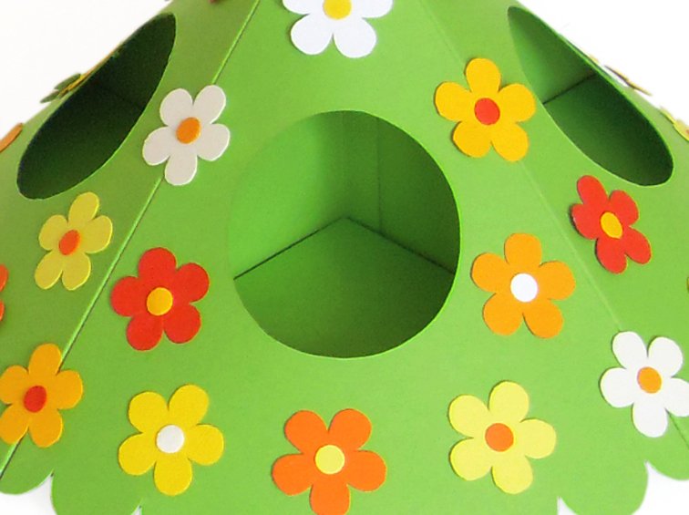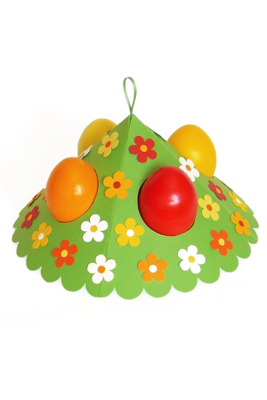 Dieser hübsche und originelle Ostereierhalter ist ganz einfach zu basteln, nur das Ausschneiden der kleinen Blumen kann etwas Zeit in Anspruch nehmen. Wenn du nicht so viele Blumen ausschneiden möchtest, kannst du entweder deren Anzahl reduzieren oder sie durch fertige Blumen (z. B. Streublumen) ersetzen.