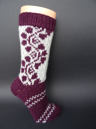 Anleitung für Socken mit Rankenmuster in Gr. 37. Für diese Socken sollte man Übung im Sockenstricken und Musterstricken mit zwei Farben haben. Die Anleitung umfasst 3 Seiten und enthält eine detailierte Beschreibung mit Mustercharts zum Stricken.