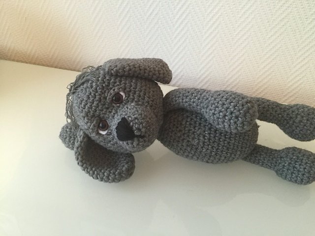 Wenn Ihr Benny glücklich machen wollt, dann häkelt ihn doch ganz schnell nach. Er wird bei der Verwendung der angegebenen Wolle ca. 36 cm von Kopf bis Fuß und ca. 26 cm wenn er sitzt.