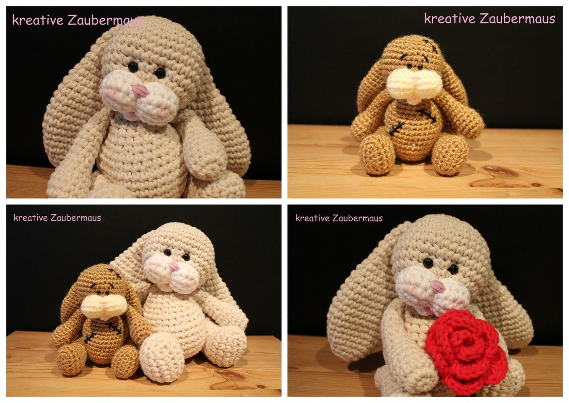 Da ich mit verschiedensten Garnen häkel, werden die Hasi´s natürlich unterschiedlich groß. Der große ist bei mir ca. 15 cm groß und der kleinere (mit dünnerer Wolle gehäkelt) ca. 10 cm groß. Lasst eurer Fantasie freien Lauf :-).