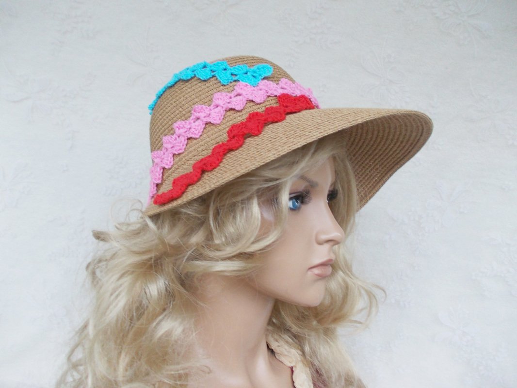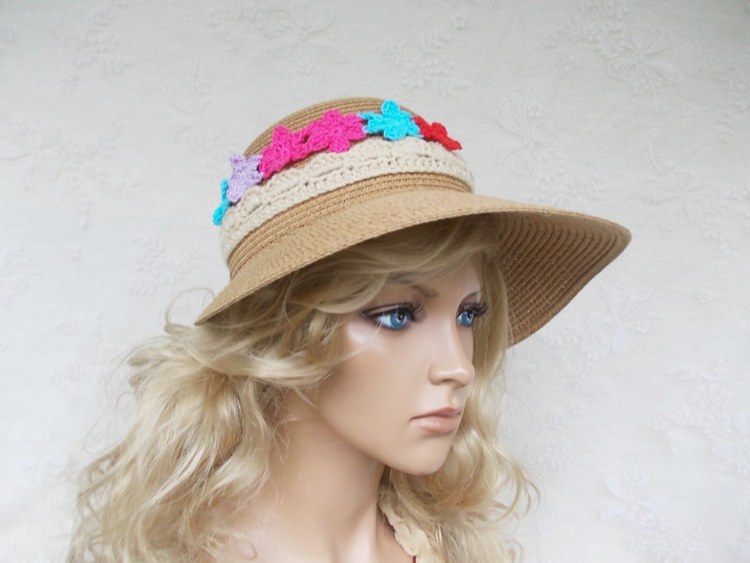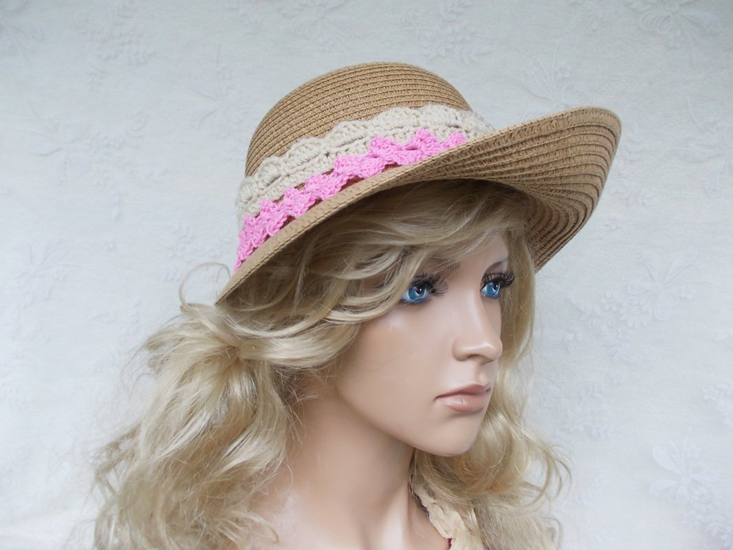 Die Strohhüte oder Stoffhüte gibt es unglaublich preiswert entweder in Supermärkten, Discountern oder in online-Shops, sie benötigen nur noch Eure Fantasie und Eure Häkelliebe und schon sind wir alle schick, da ein Hut immer ein Schmuckstück ist. Ich habe mal eine andere Hutform für meine Fotos verwendet.