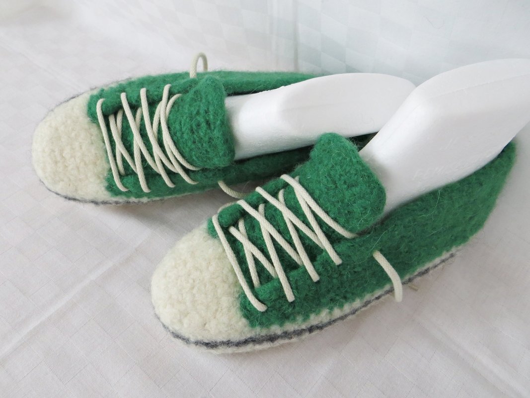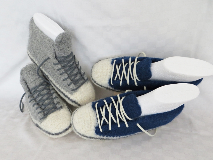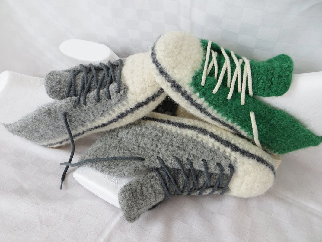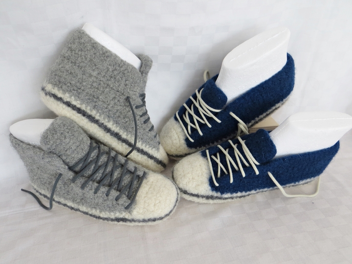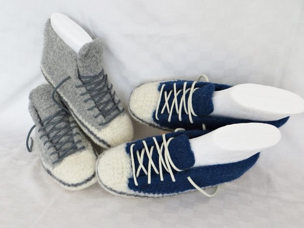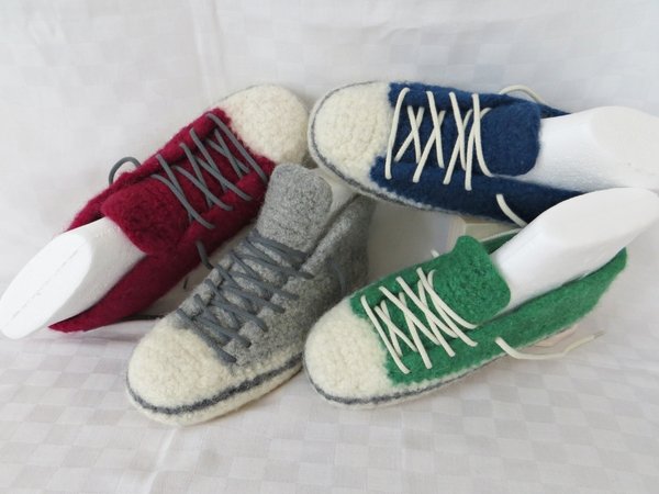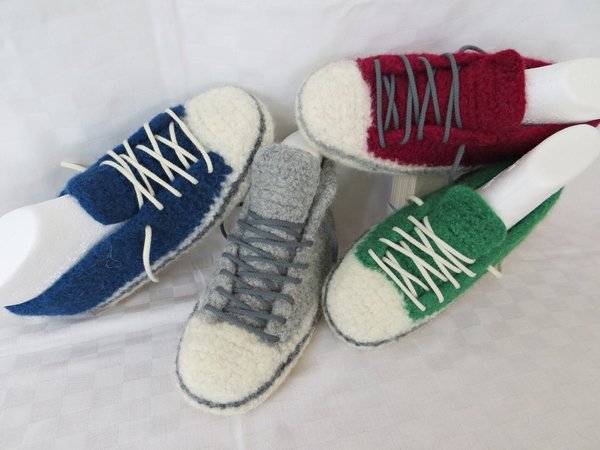 Die Turnschuhe werden gehäkelt und anschließend in der Waschmaschine gefilzt