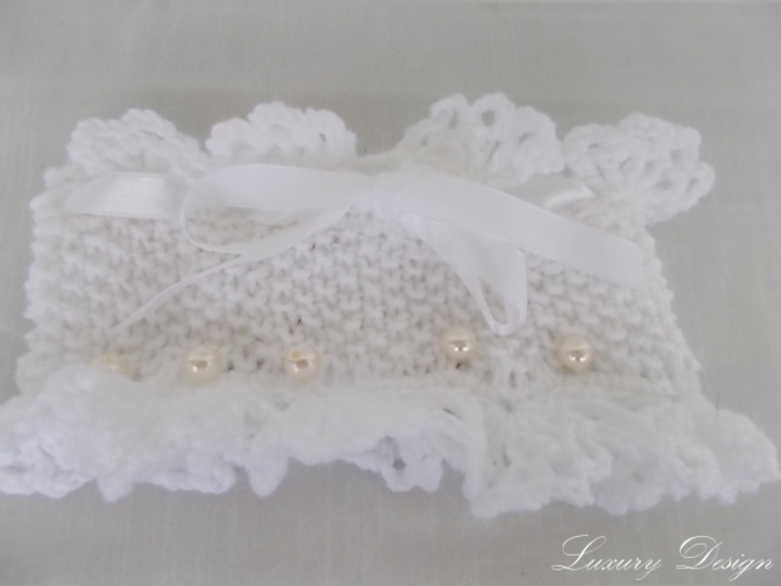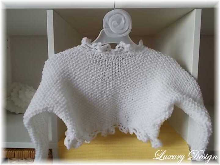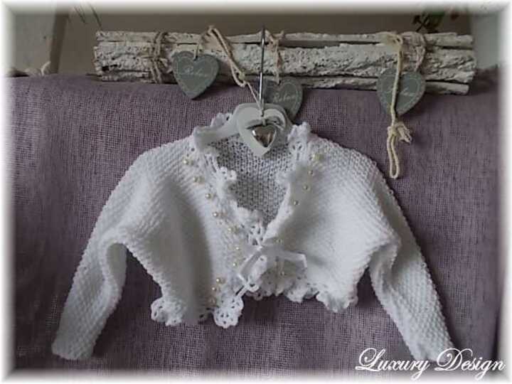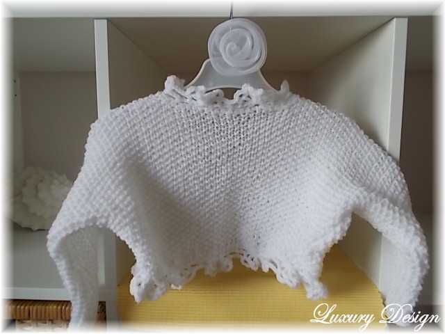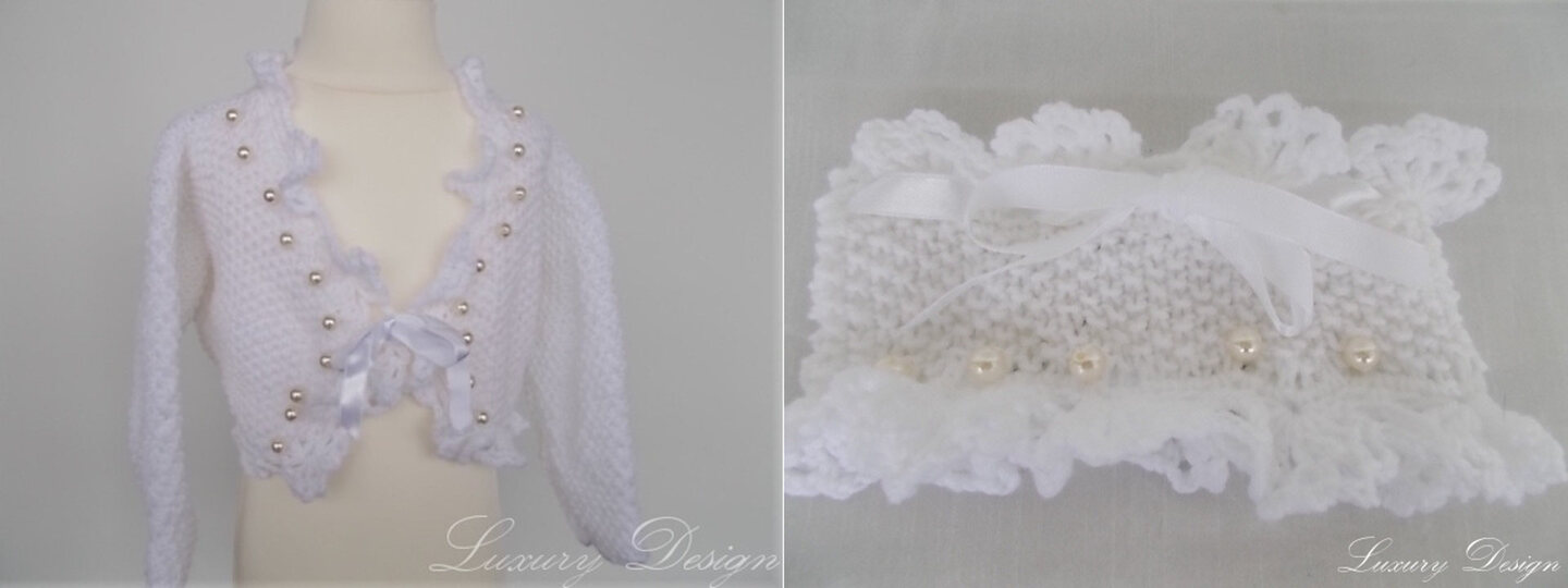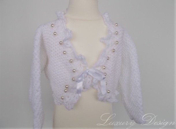 Eine süße Jacke für kleine Mädchen die in weiß sehr gut zur Taufe getragen werden kann mit passendem Stirnband wird das Outfit komplett.