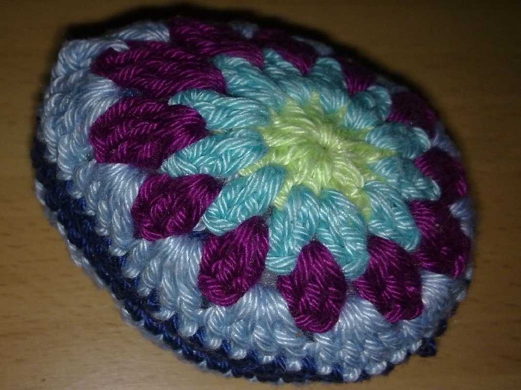 Es kann auch andere Wolle und die dazu passende Häkelnadel verwendet werden. Dies kann zu leichten Abweichungen in der Form der Eier führen.