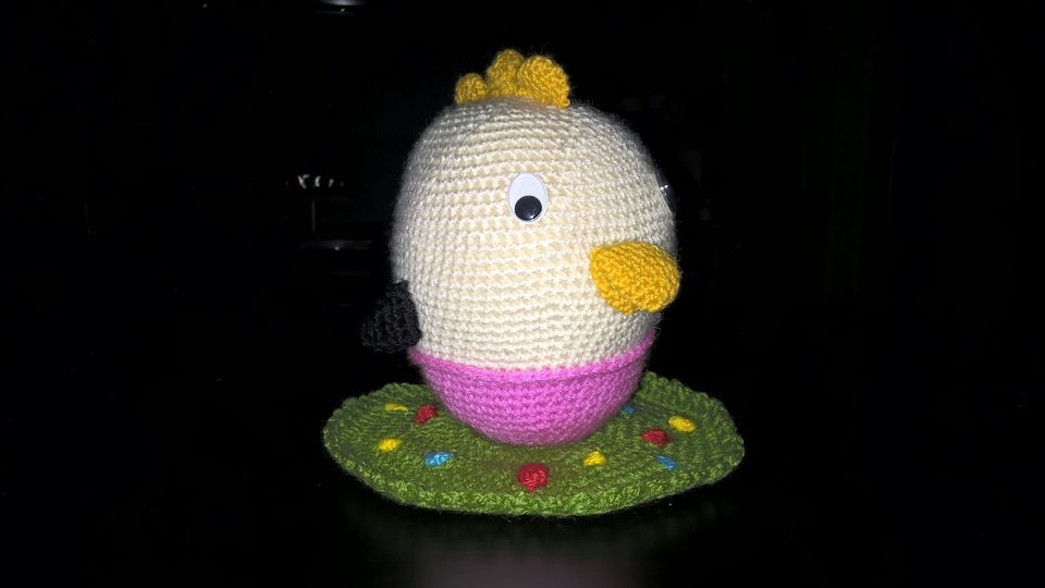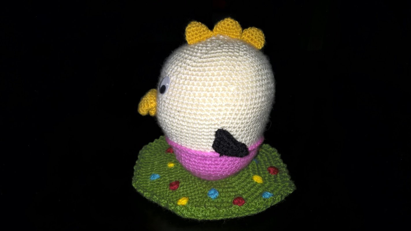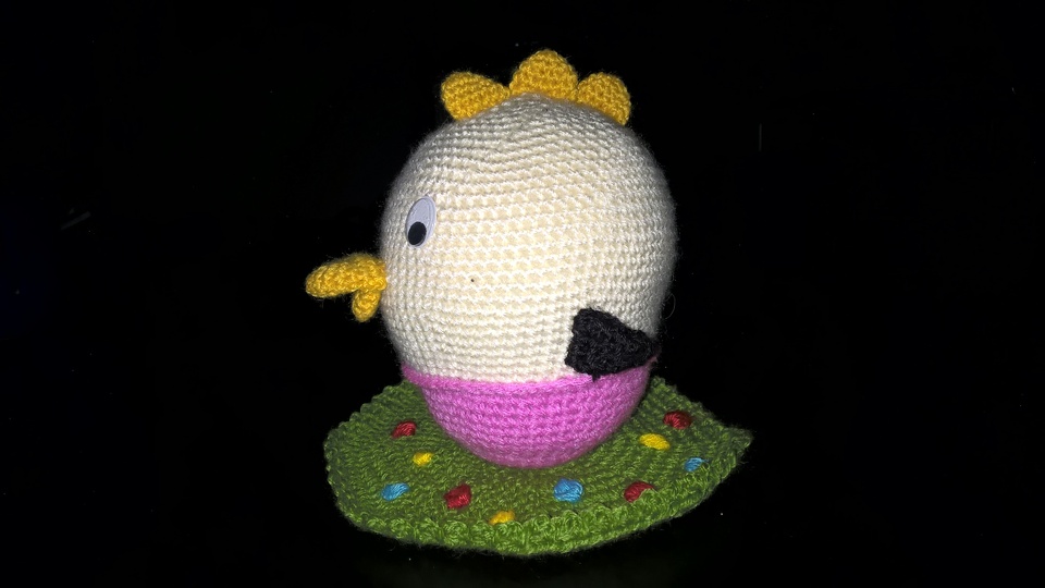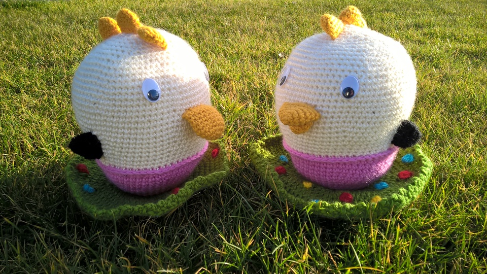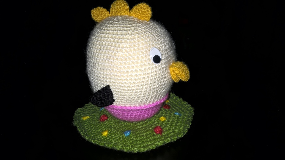 Detaillierte und gut bebilderte Häkelanleitung für den Osterhenne „Henrietta“ auf einer bunten Wiese.