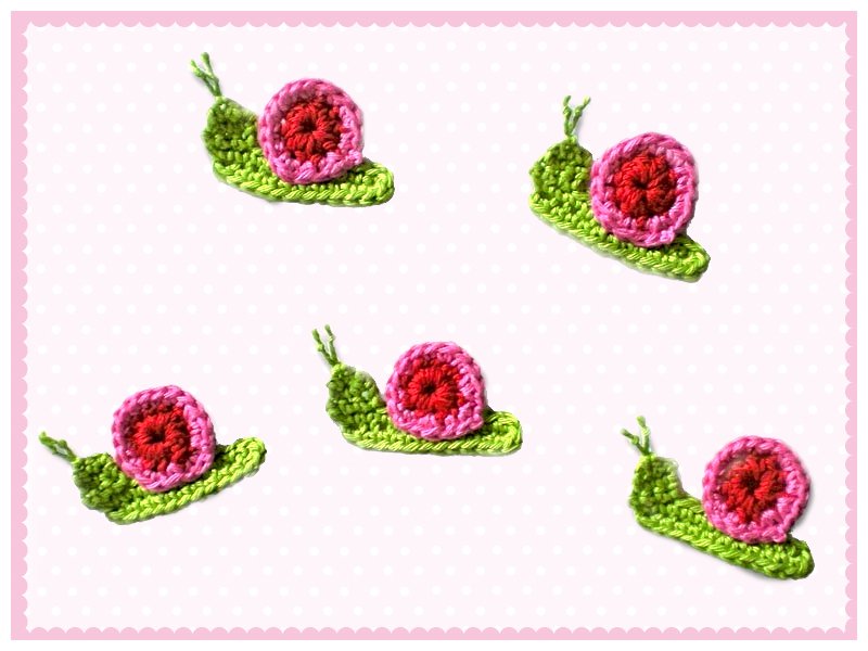 Eine ausführliche Häkelanleitung für eine Schnecke, eine kleine Schnecke und ein 3D-Blümchen.
