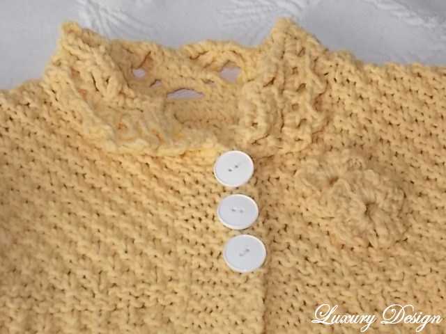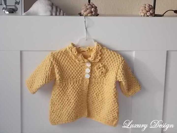 Eine modern designte Strickjacke für Kleinkinder in Sonnengelb. Der auffällige Häkelkragen unterstreicht den modernen Look für Kinder. Ideal für die ersten Frühlingsspaziergänge. Ein einfaches Perlmuster das auch für Strickanfänger geeignet ist.