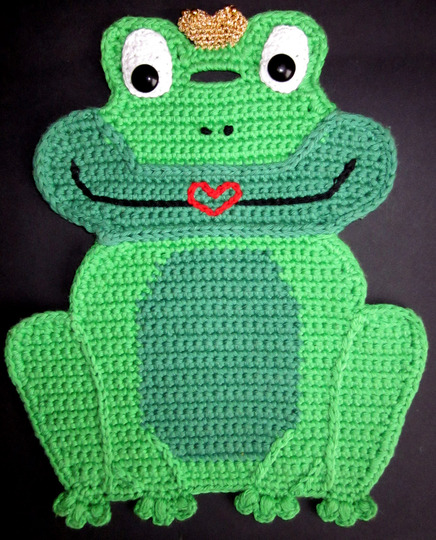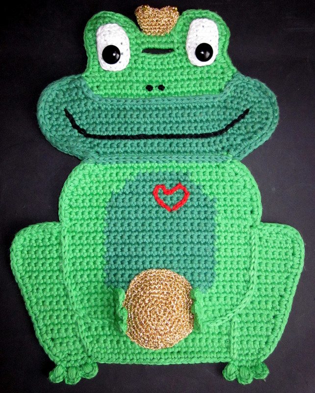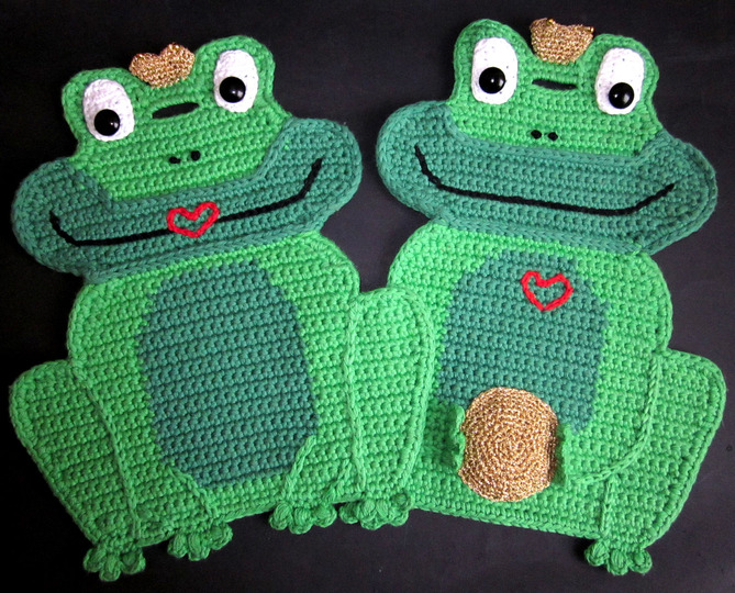 Froschkönig mit Königin als Topflappen oder Wanddekoration in der Küche Selbst ausgedacht, aufgeschrieben und mit der Häkelnadel ausprobiert.