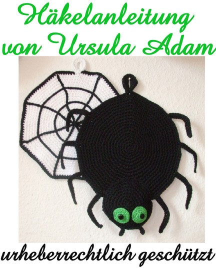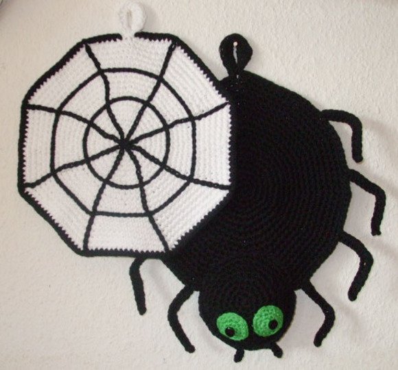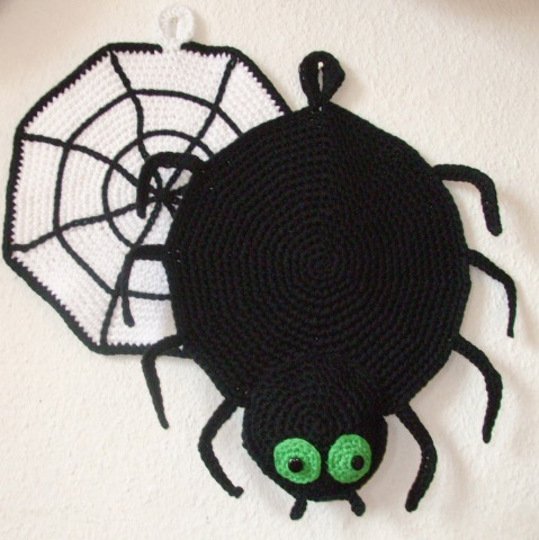 Spinne mit Spinnennetz als Topflappen oder Wanddekoration in der Küche Selbst ausgedacht, aufgeschrieben und mit der Häkelnadel ausprobiert.