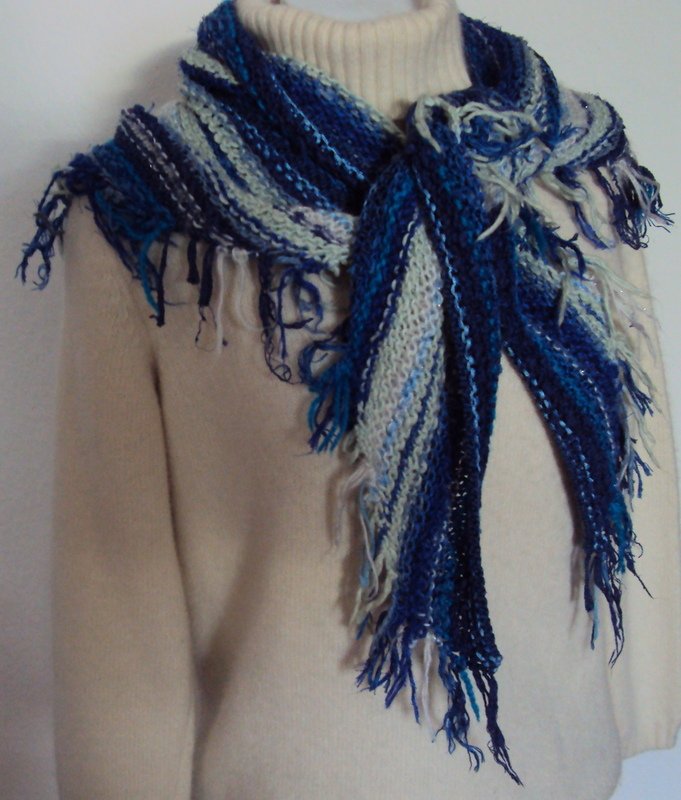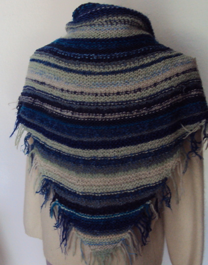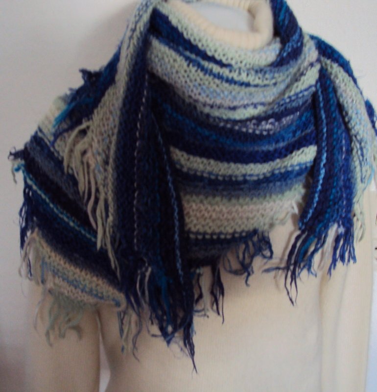 ein gestrickter Schal aus Wollresten. Genommen habe ich alles was anfiel an Resten, Baumwollgarn, Bändchengarn, Mohair, Wolle etc.