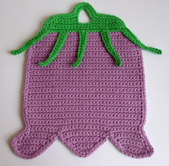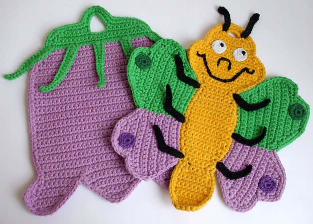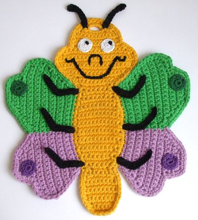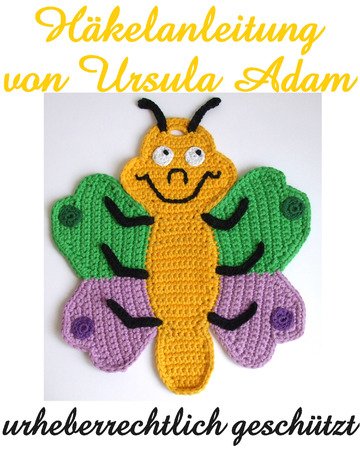 Ein kleiner Schmetterling mit Glockenblume als Topflappen oder Wanddekoration in der Küche Selbst ausgedacht, aufgeschrieben und mit der Häkelnadel ausprobiert.