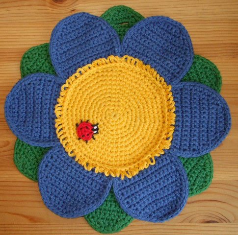 Ein Blatt mit Blüte und kleinem Marienkäfer als Topflappen oder Wanddekoration in der Küche Selbst ausgedacht, aufgeschrieben und mit der Häkelnadel ausprobiert.