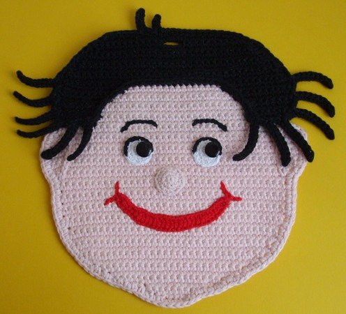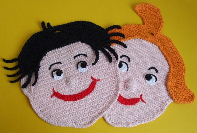 Max und Moritz, die beiden Schlingel, als Topflappen oder Wanddekoration in der Küche Selbst ausgedacht, aufgeschrieben und mit der Häkelnadel ausprobiert.