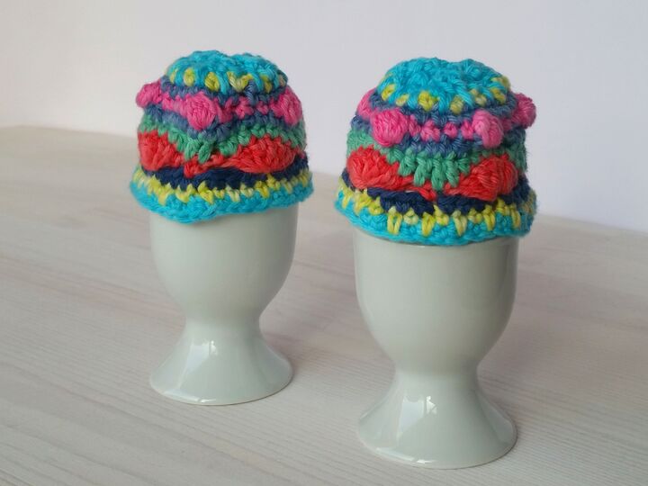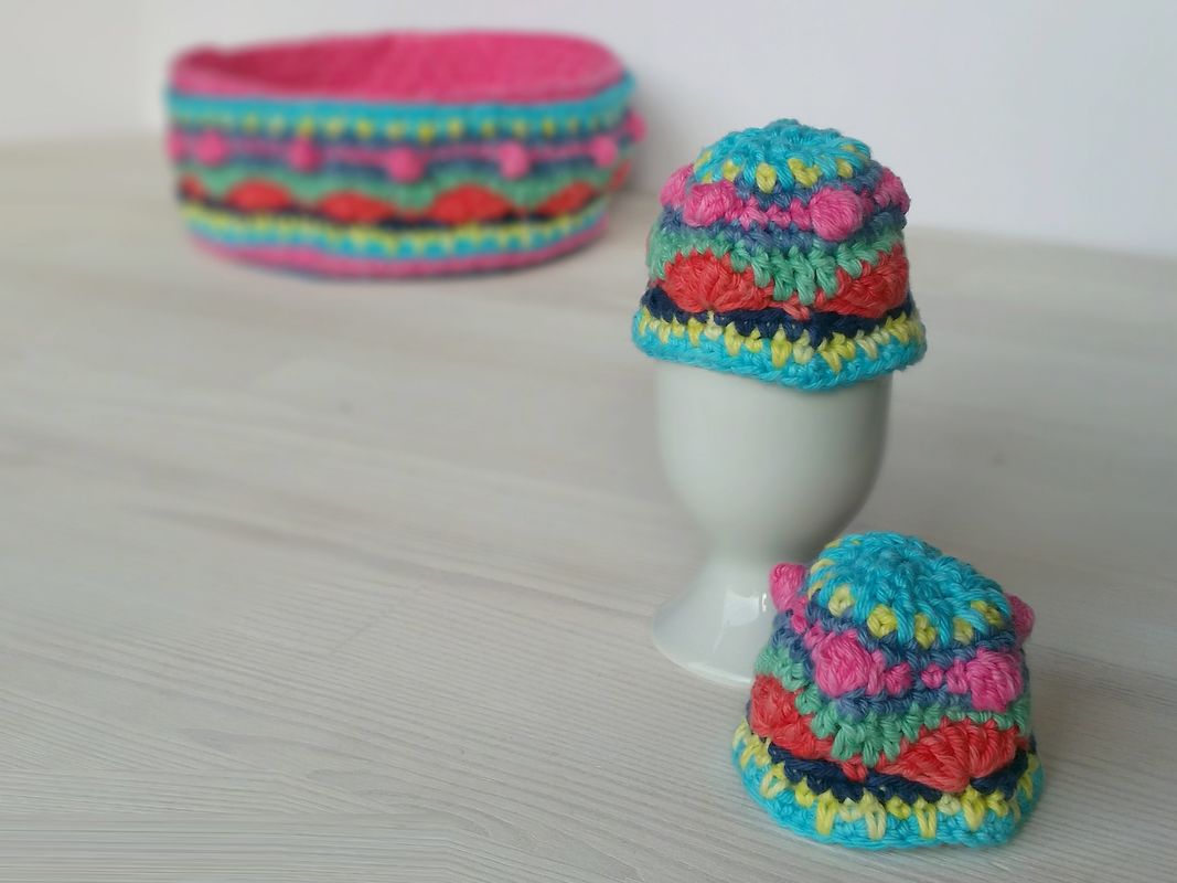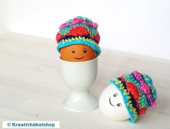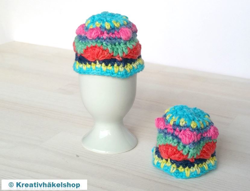 Durch die frischen Farben und das tolle Muster sind die Eierwärmer ein echter Hingucker!
