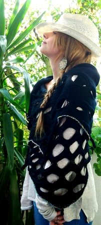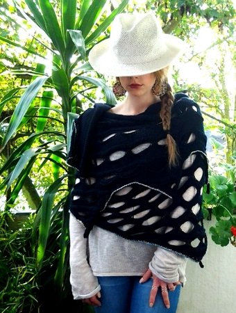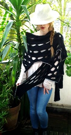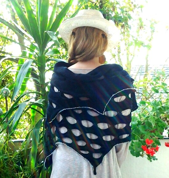 Niteflite ist ein ca. 3 m langes asymmetrisches Zipfeltuch, das auch als Schal verwendet werden kann. Die Möglichkeiten, es zu tragen, sind sehr vielfältig. Dabei dienen die Löcher nicht nur als Design-Element. Sie verhelfen auch zu ungeahnten Möglichkeiten, das Tuch zu drapieren und in der gewünschten Position zu halten.